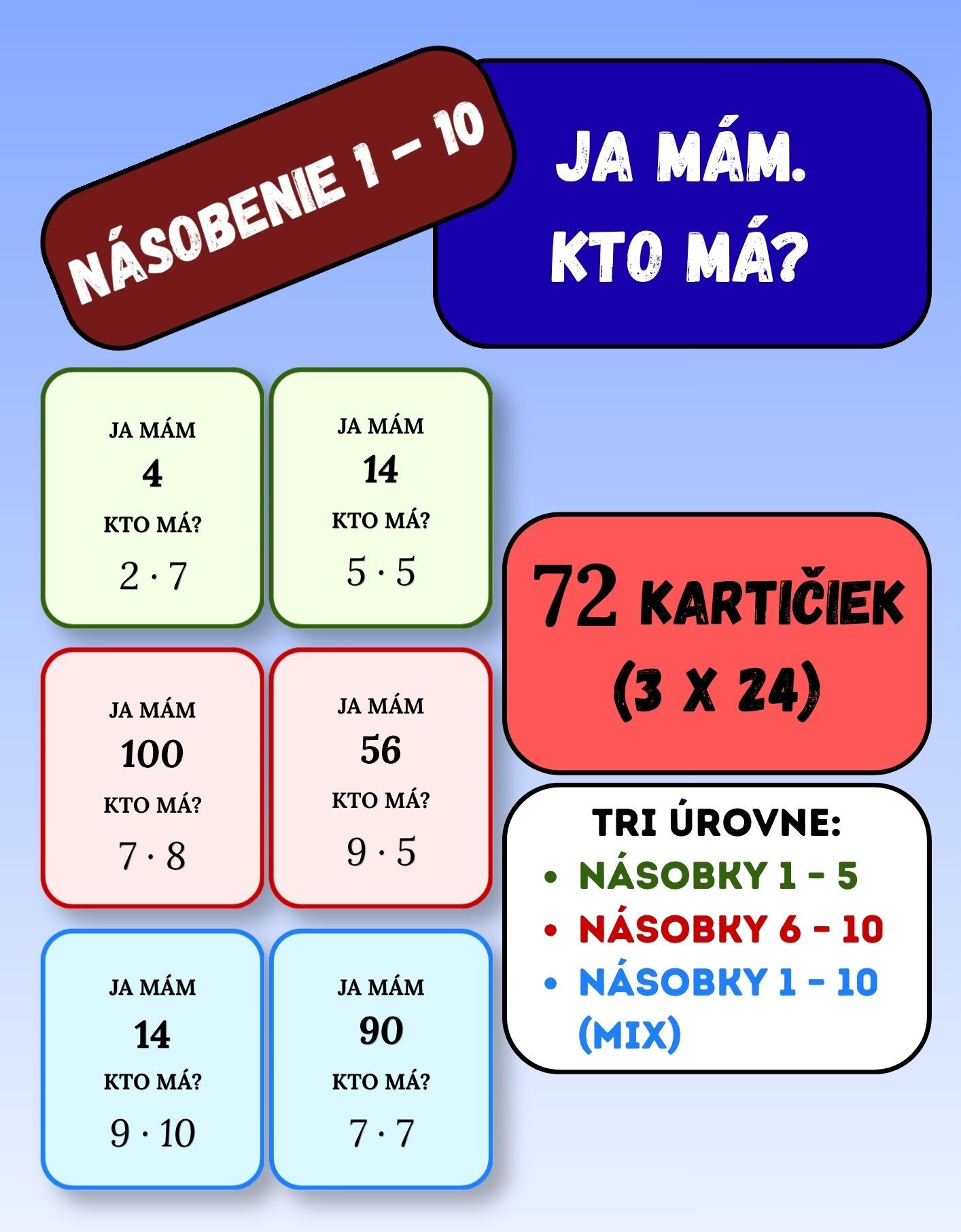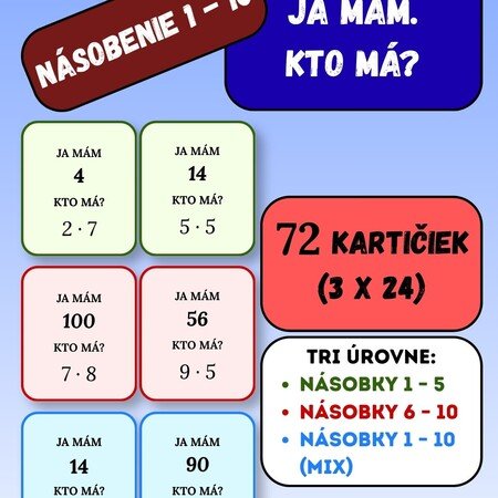 Sada obsahuje 72 kartičiek s príkladmi na násobenie rozdelených podľa náročnosti (1–5, 6–10, 1–10 mix), takže ju jednoducho prispôsobíte úrovni vašich žiakov. Stačí rozdať kartičky a hra môže začať – deti si prirodzene precvičujú násobenie a zároveň sa výborne zabavia.