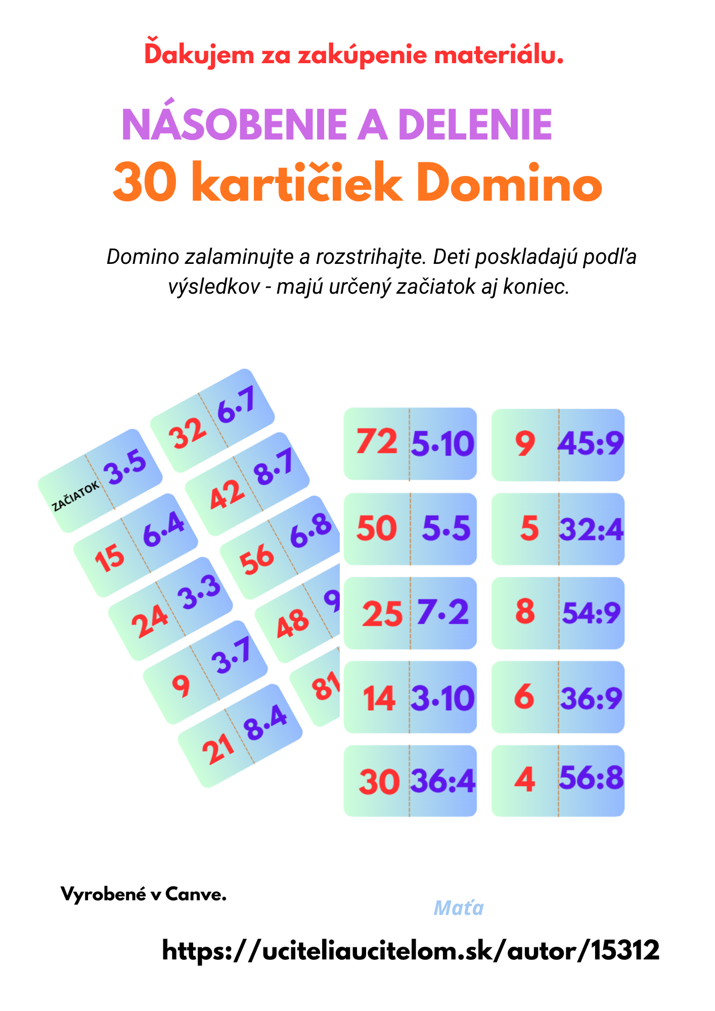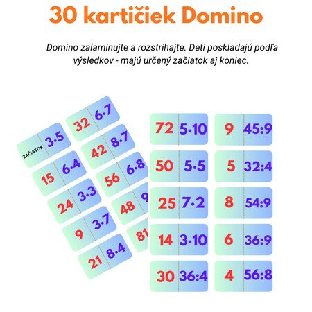 Násobenie a delenie - Domino. 30 kartičiek. Domino zalaminujte a rozstrihajte. Deti poskladajú podľa výsledkov - majú určený začiatok aj koniec.