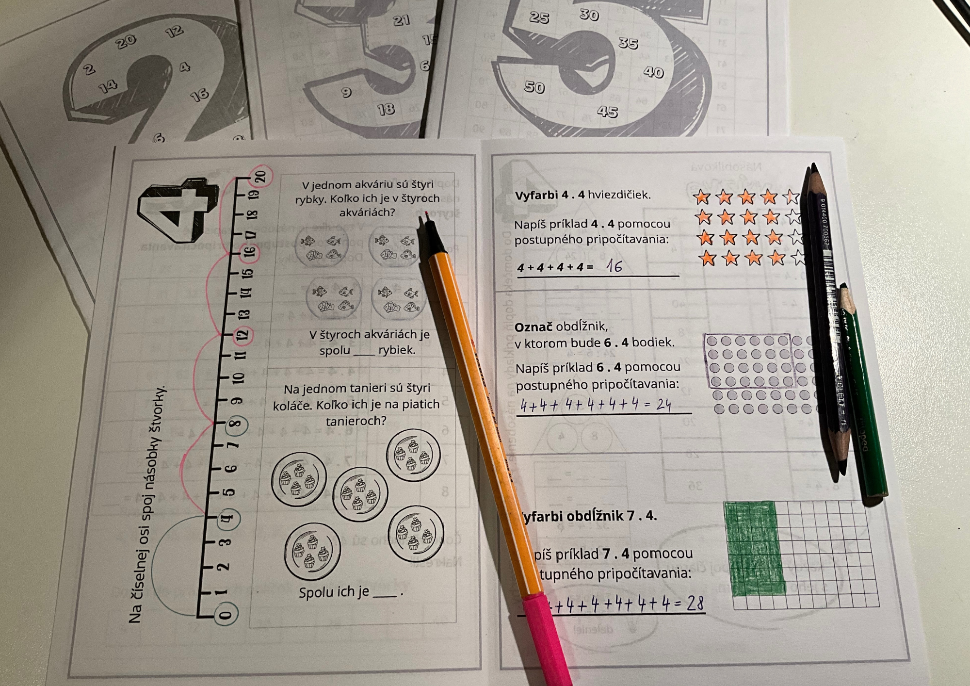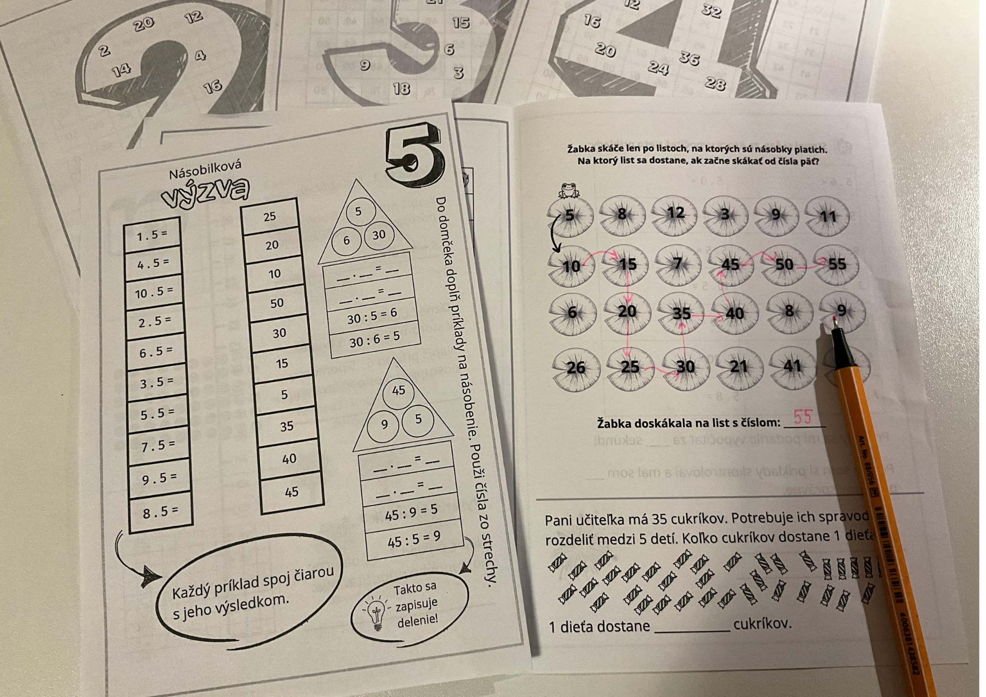 - Vytlačiť ako brožúru/booklet obojstranne na A4 (pre jedného žiaka potrebujete 2 listy)