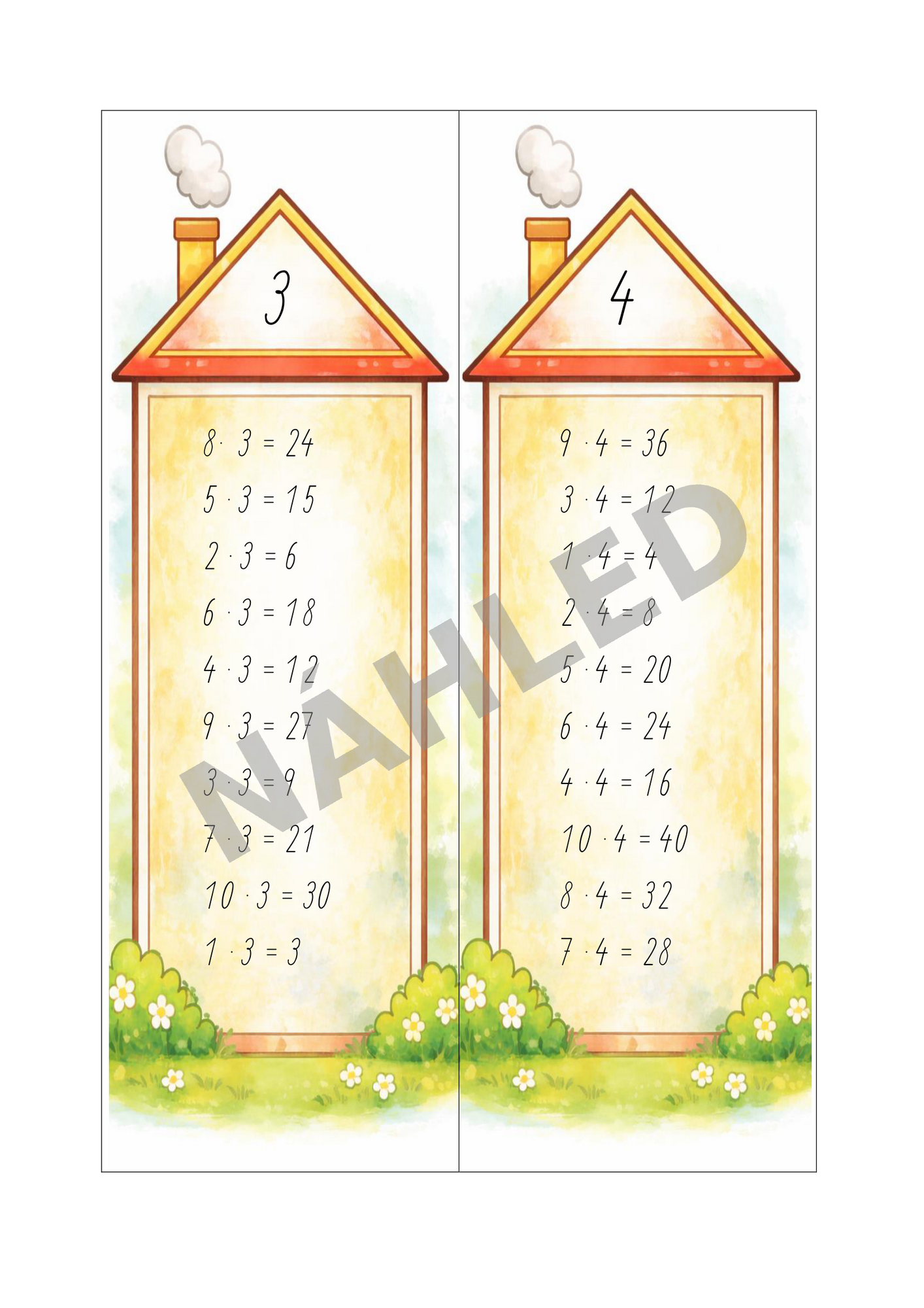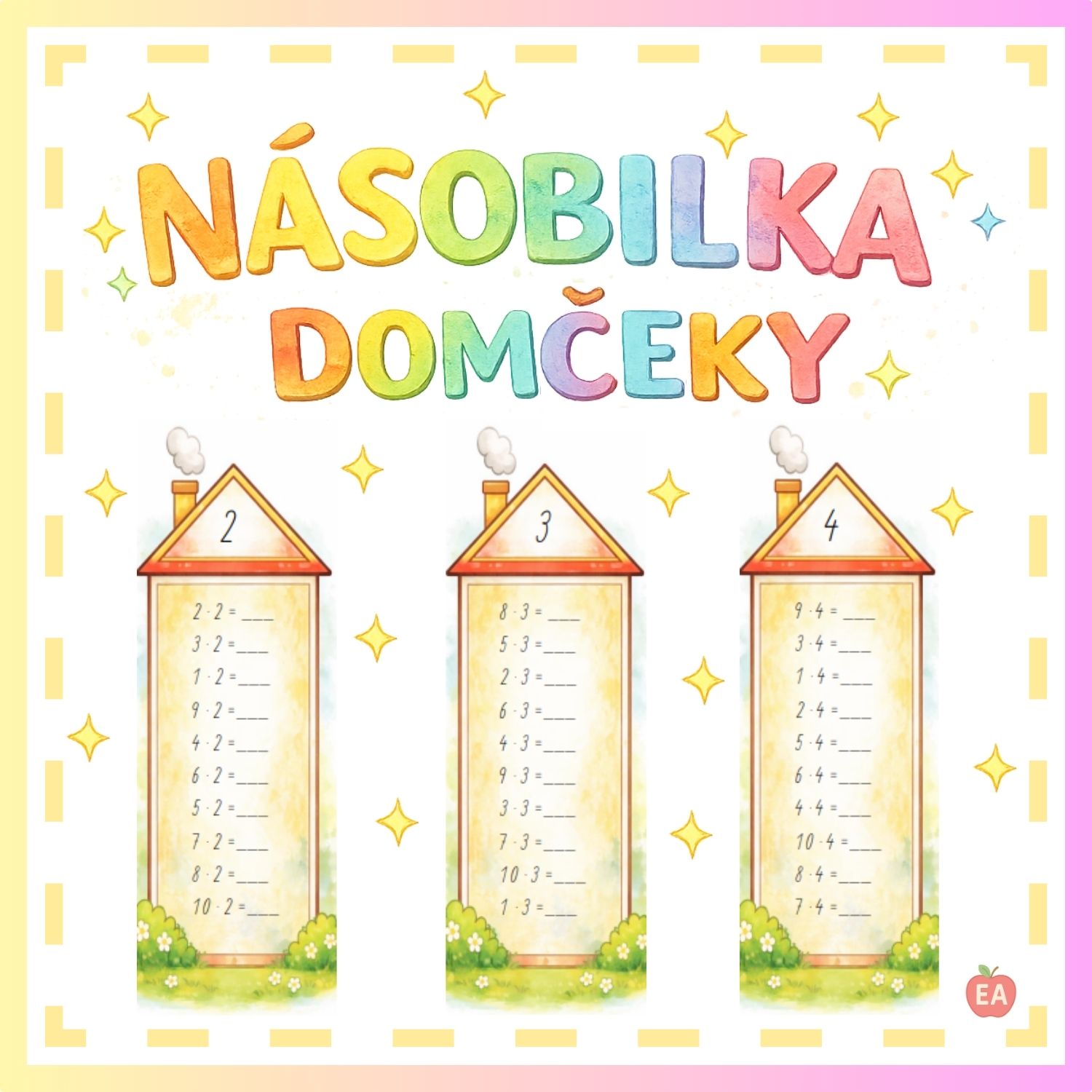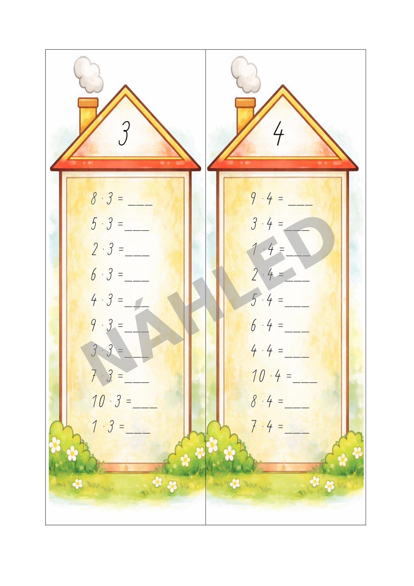 Súbor obsahuje 14 kartičiek, na každej z nich je 10 príkladov na násobenie. Prvých desať kartičiek je zameraných vždy na jeden násobkový rad, posledné štyri kartičky obsahujú násobilku pomiešanú a slúžia na overenie, či deti zvládajú príklady bez opory
