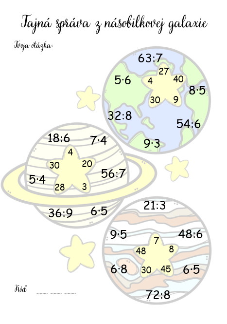 Materiál obsahuje 24 pracovných listov, na každom 18 príkladov z násobenia a delenia. Deti riešením príkladov získavajú číselný kód, pomocou ktorého si nájdu galaktickú odpoveď na svoju otázku.