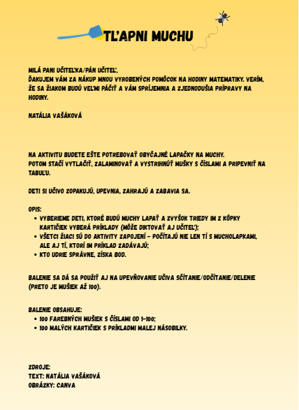 Dá sa použiť aj na upevňovanie učiva sčítanie/odčítanie/delenie (preto je mušiek až 100), takže mušky môžete používať naozaj často.