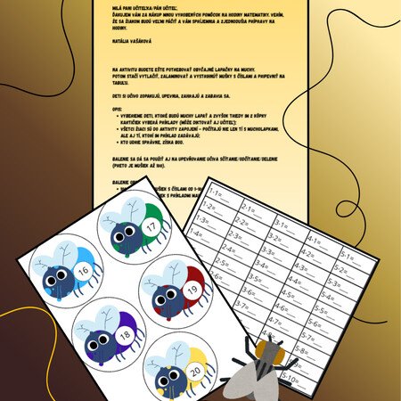 - vyberieme deti, ktoré budú muchy lapať a zvyšok triedy im z kôpky kartičiek vyberá príklady (môže diktovať aj učiteľ);