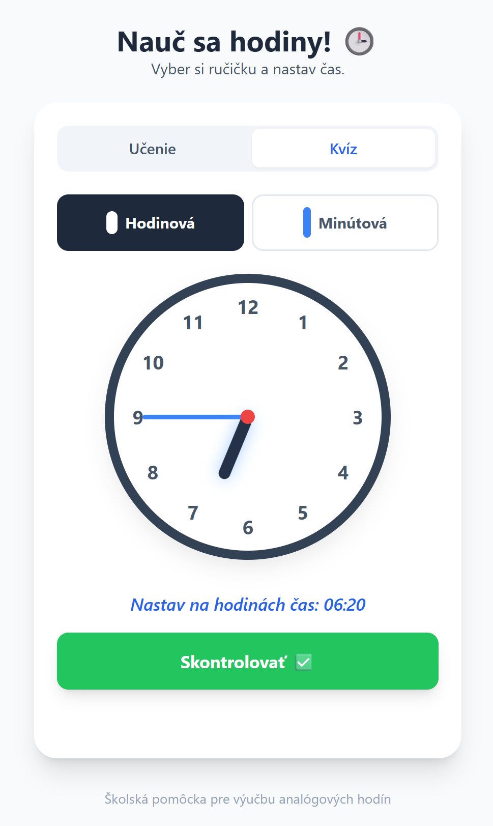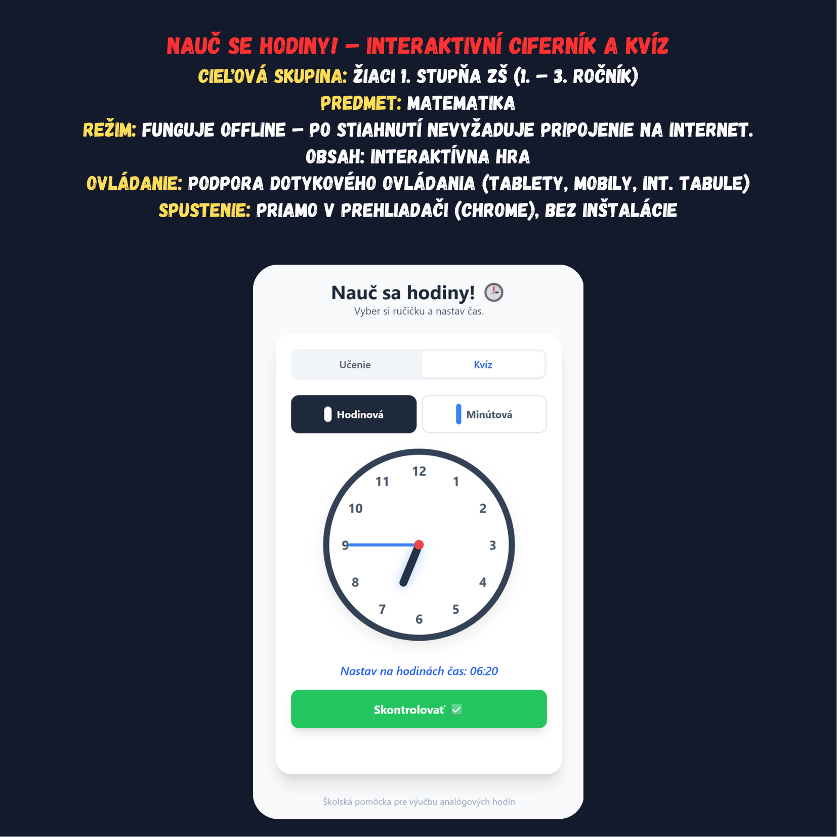 - Režim Kvíz: Automatické generovanie úloh (napr. „Nastav na hodinách 08:30“).