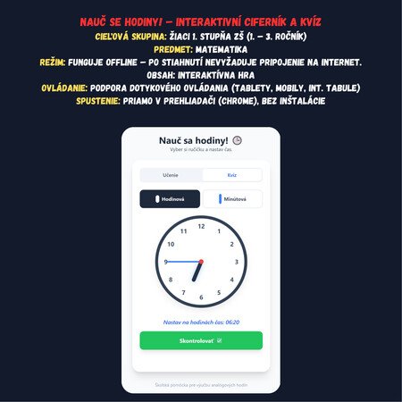 Hľadáte modernú a intuitívnu pomôcku na výučbu času? Táto interaktívna aplikácia nahradí papierové modely hodín a prinesie do vašej triedy digitálnu hravosť!