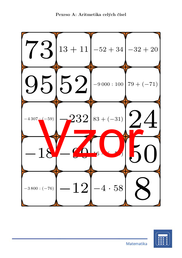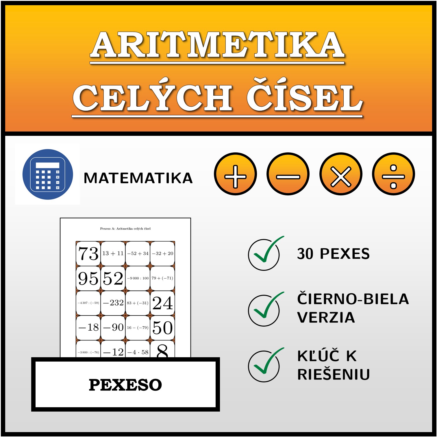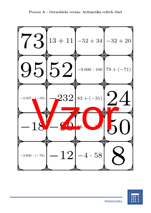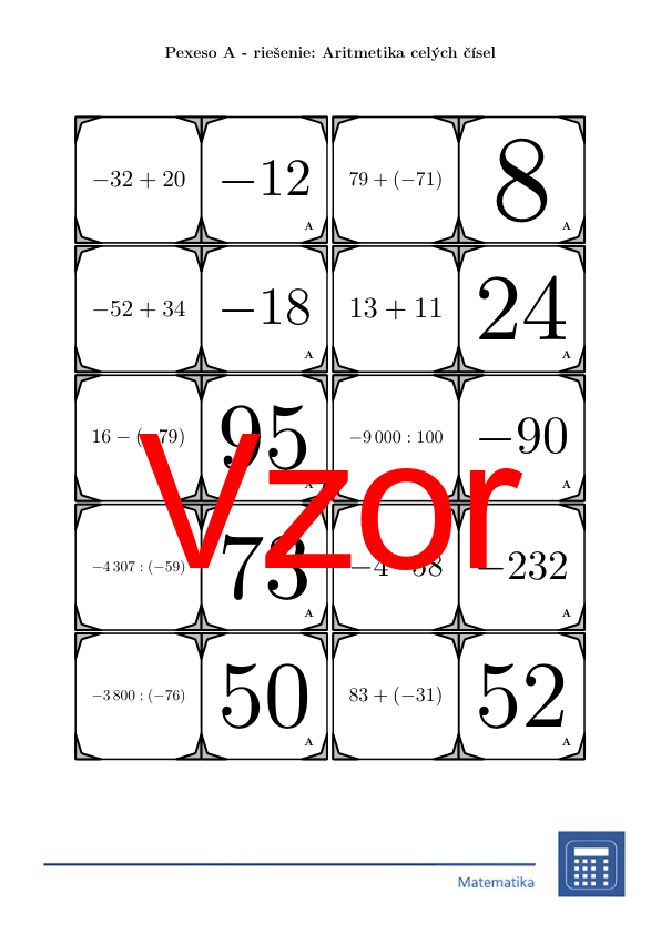 V materiáli sa nachádza celkom 30 sád pexesa na tému aritmetika celých čísel v nasledujúcom usporiadaní: