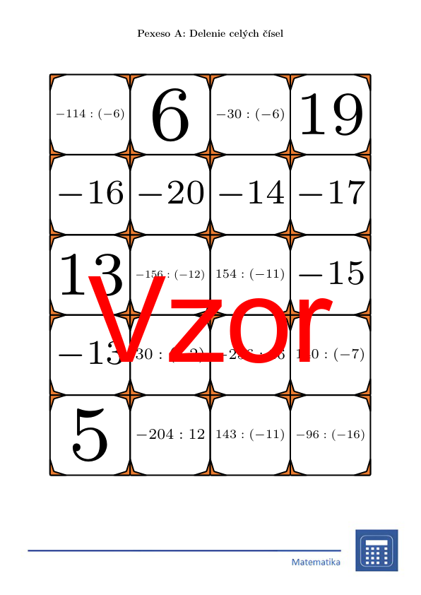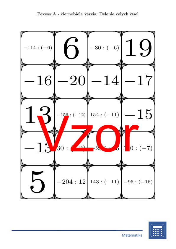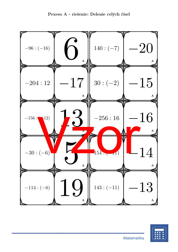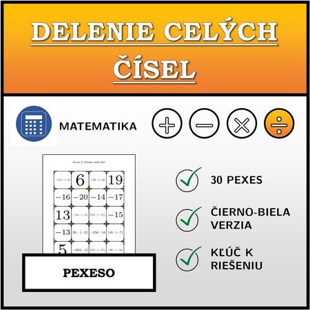 V materiáli sa nachádza celkom 30 sád pexesa na tému delenie celých čísel v nasledujúcom usporiadaní: