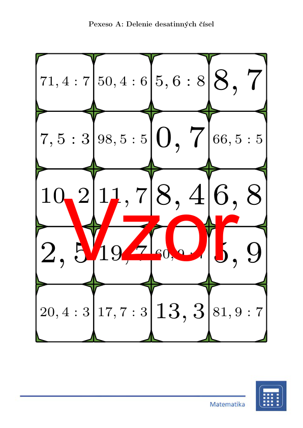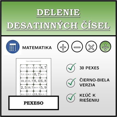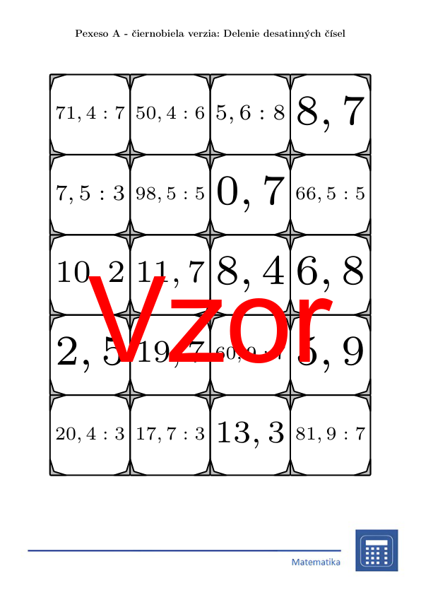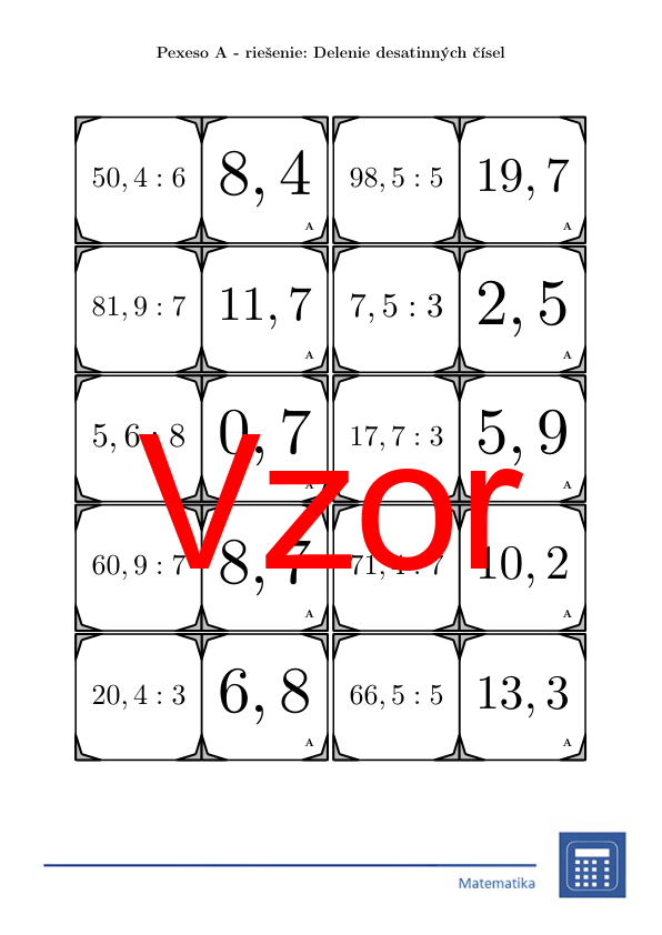 V materiáli sa nachádza celkom 30 sád pexesa na tému delenie desatinných čísel v nasledujúcom usporiadaní: