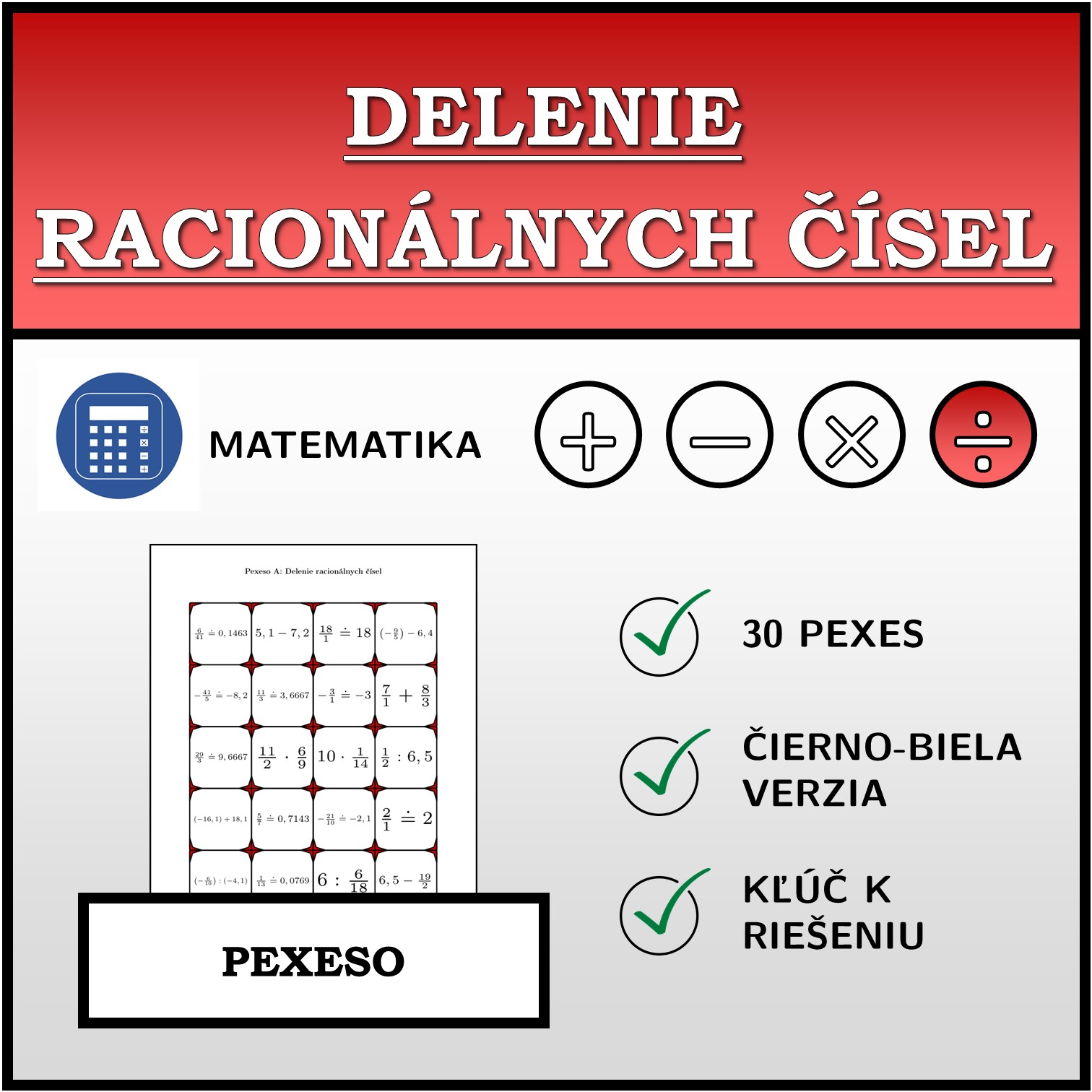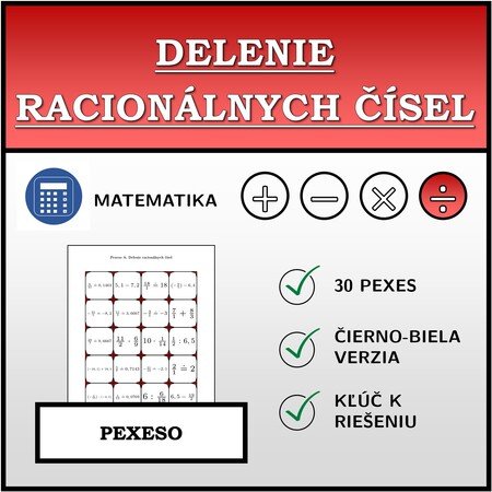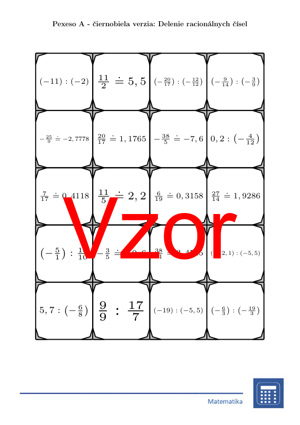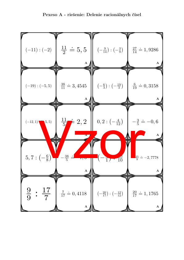 V materiáli sa nachádza celkom 30 sád pexesa na tému delenie racionálnych čísel v nasledujúcom usporiadaní: