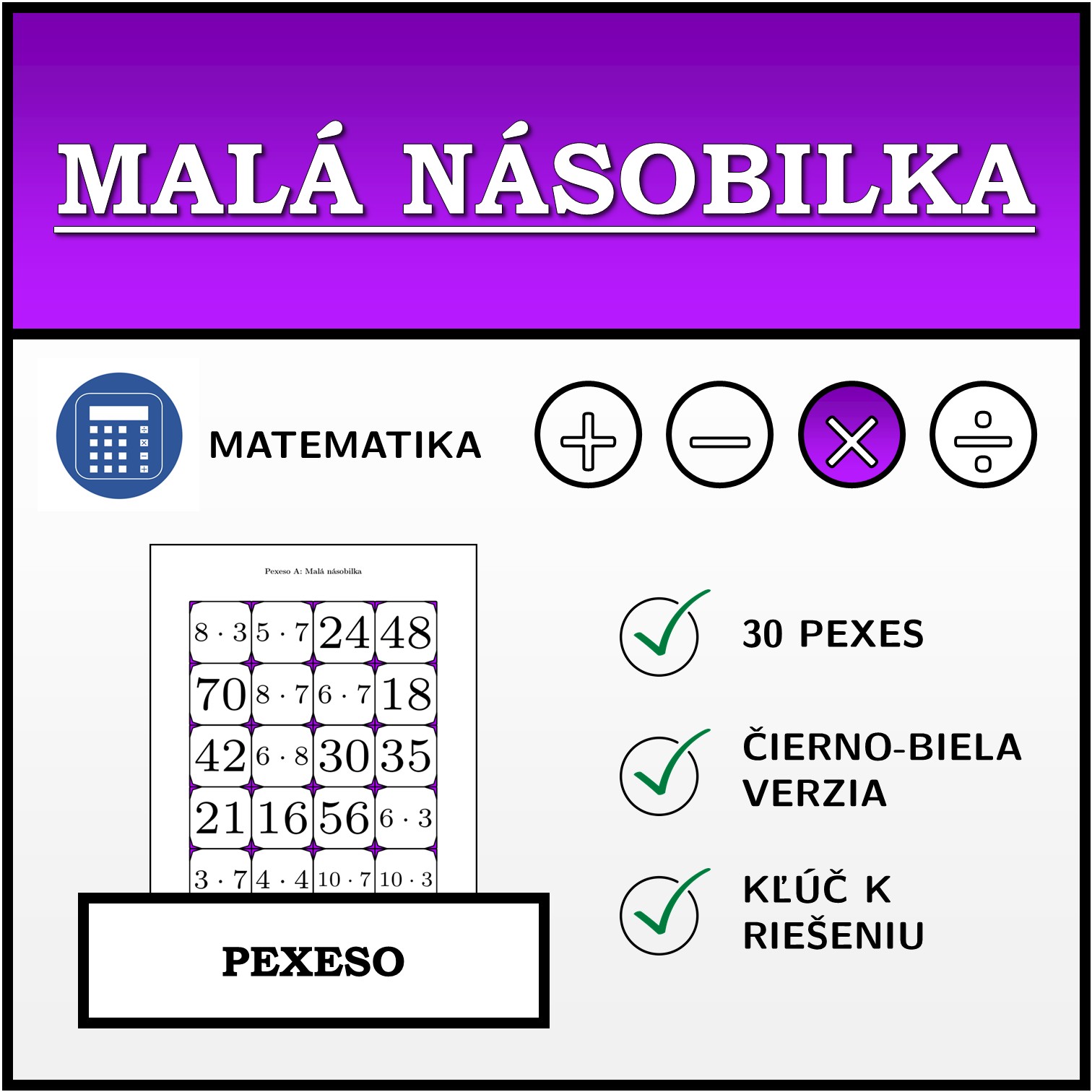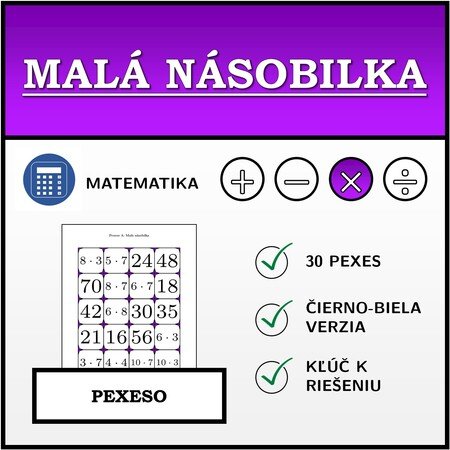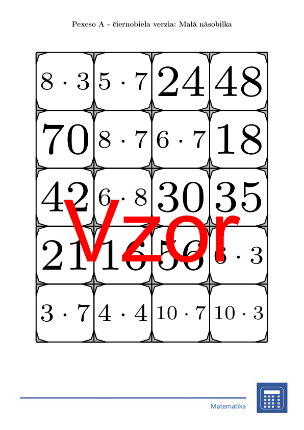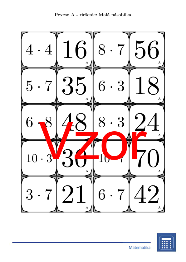 V materiáli sa nachádza celkom 30 sád pexesa na tému malá násobilka v nasledujúcom usporiadaní: