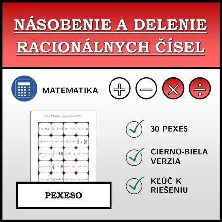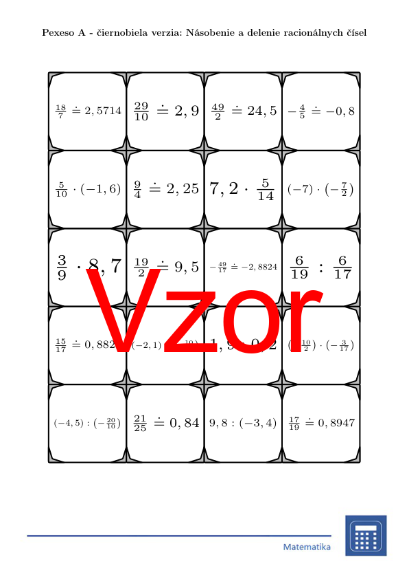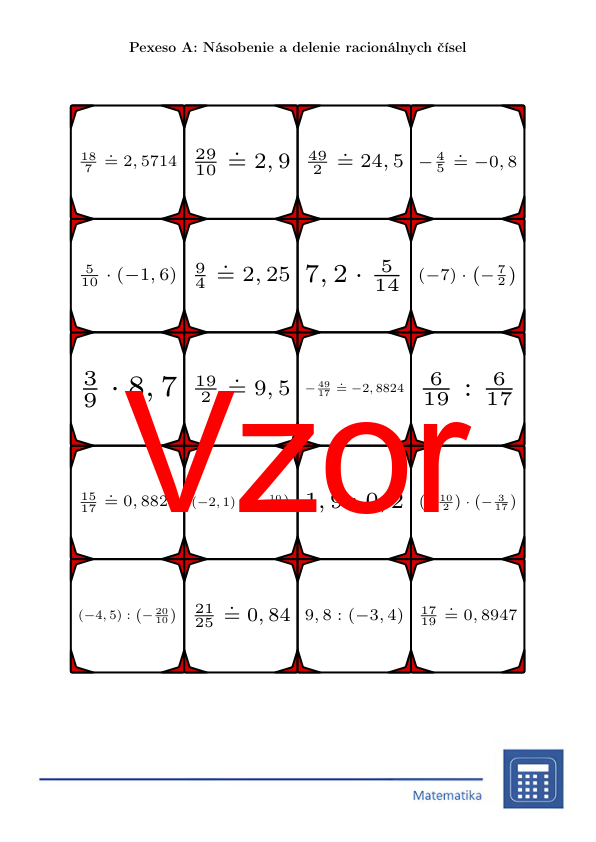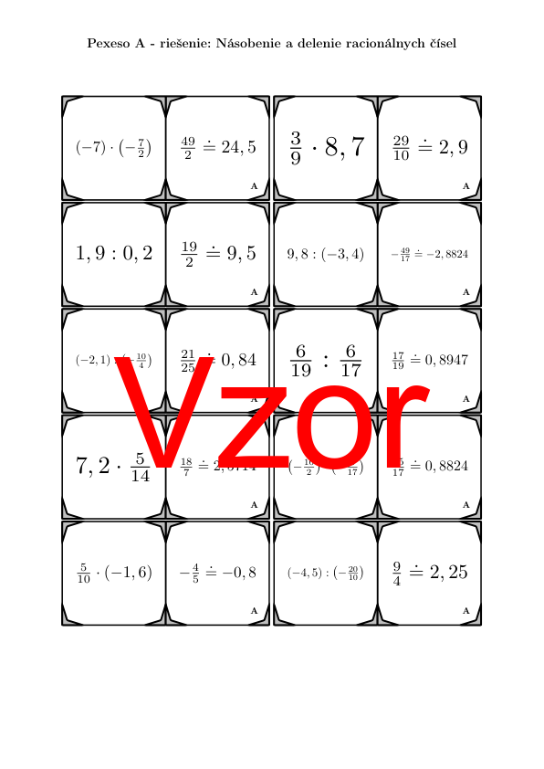V materiáli sa nachádza celkom 30 sád pexesa na tému násobenie a delenie racionálnych čísel v nasledujúcom usporiadaní: