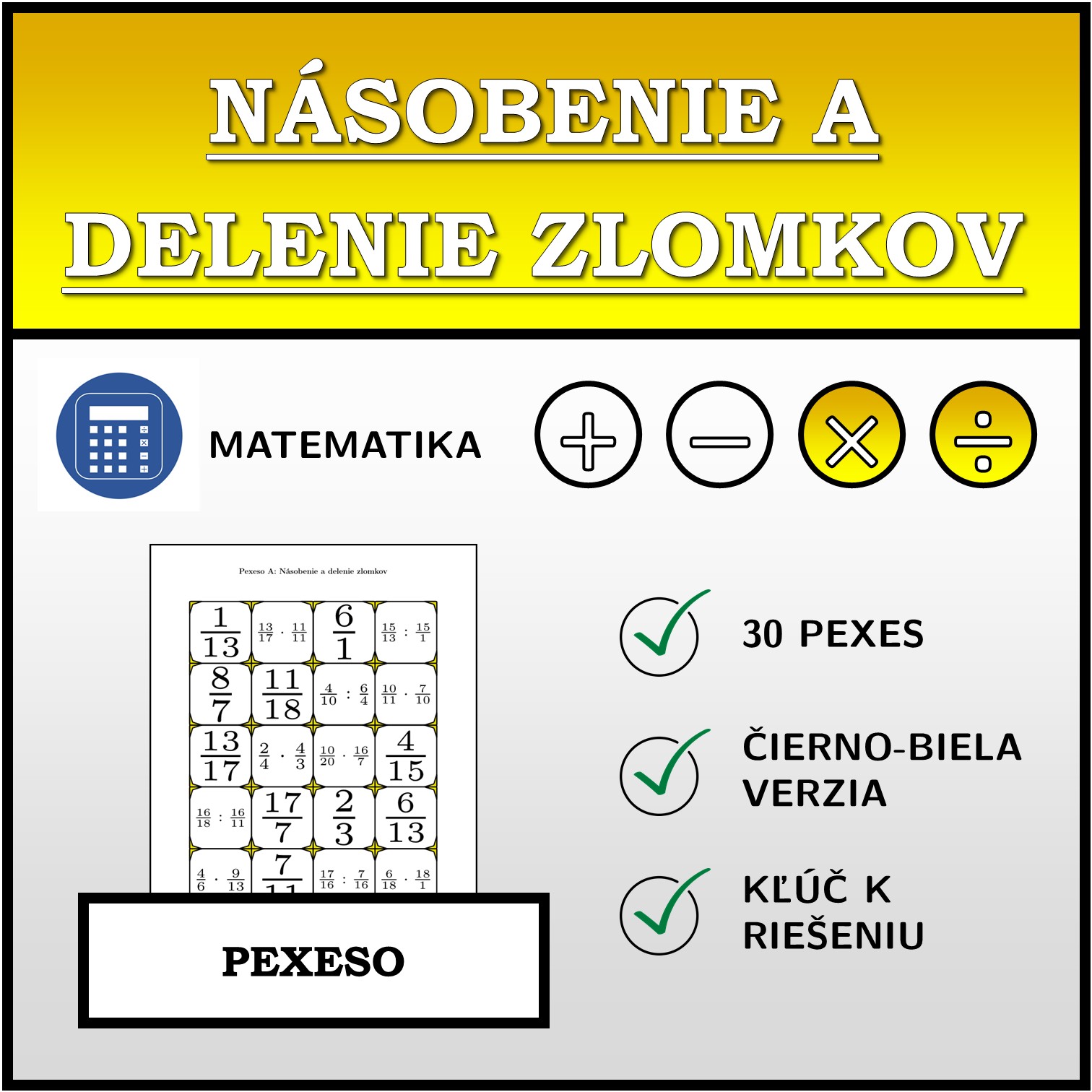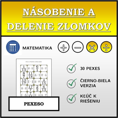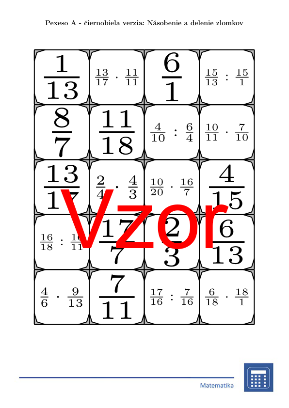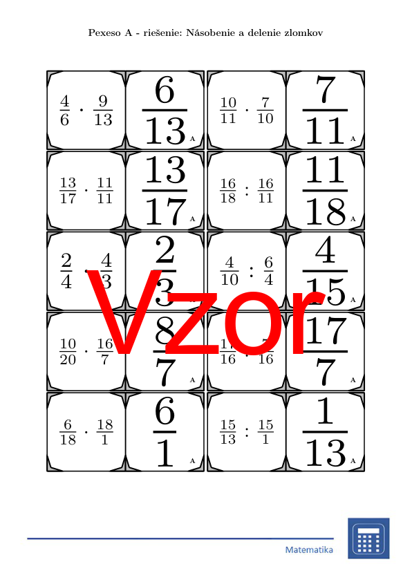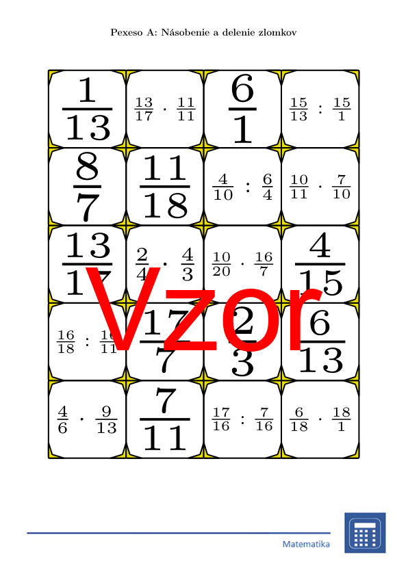 V materiáli sa nachádza celkom 30 sád pexesa na tému násobenie a delenie zlomkov v nasledujúcom usporiadaní: