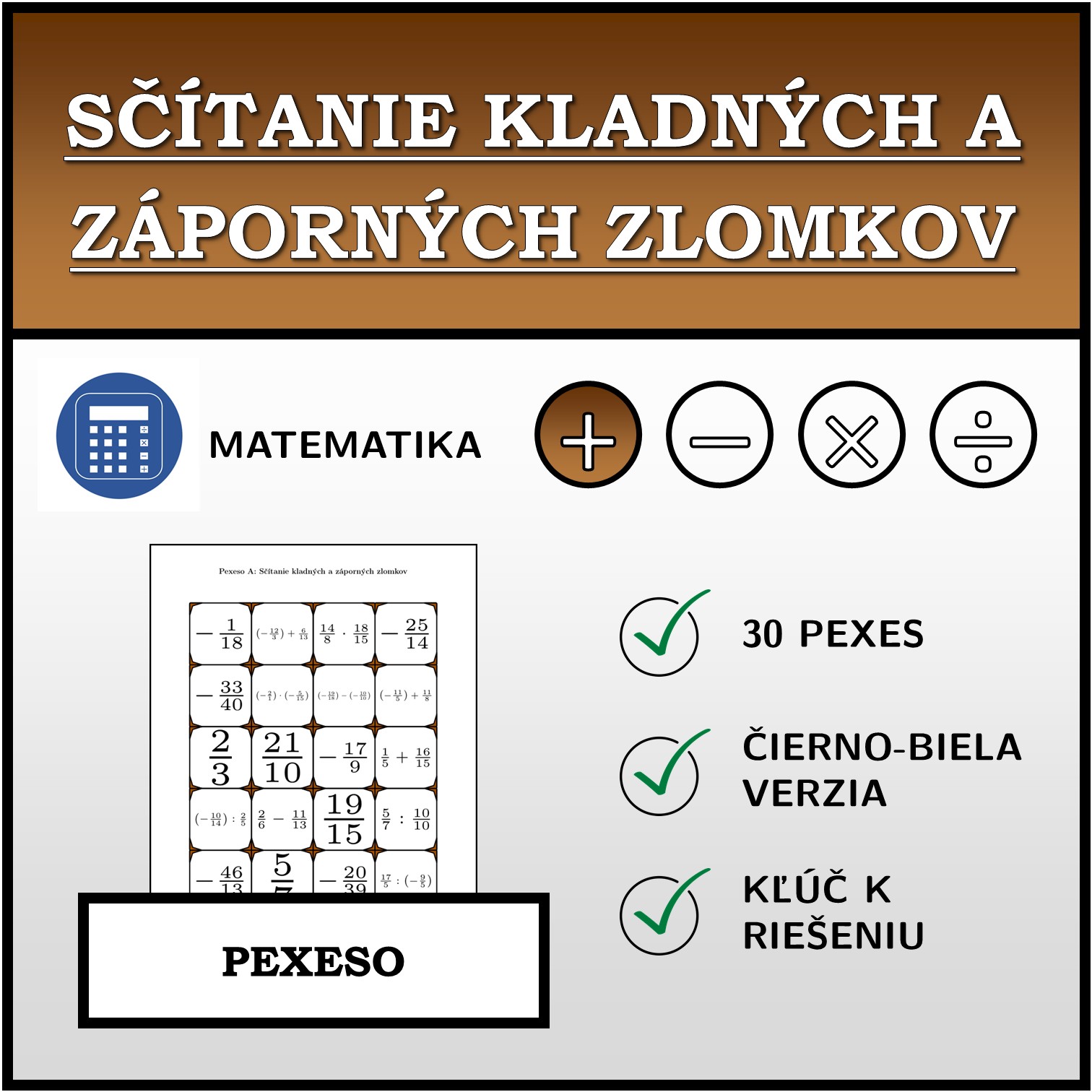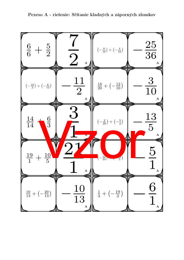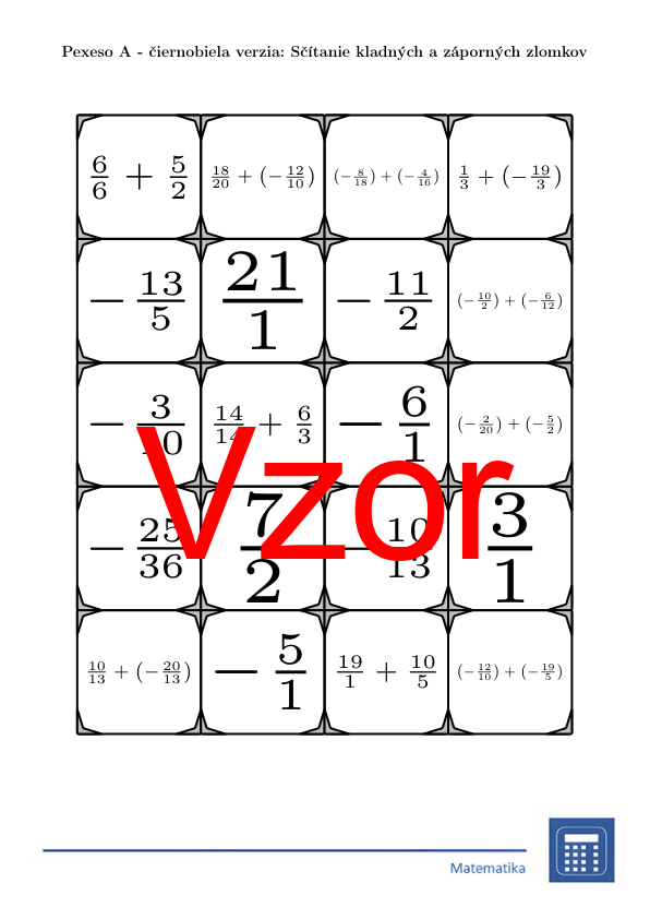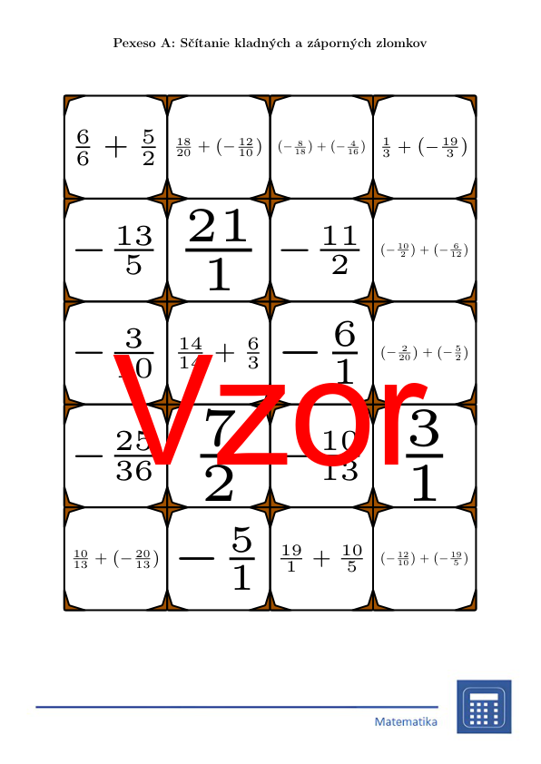 V materiáli sa nachádza celkom 30 sád pexesa na tému sčítanie kladných a záporných zlomkov v nasledujúcom usporiadaní: