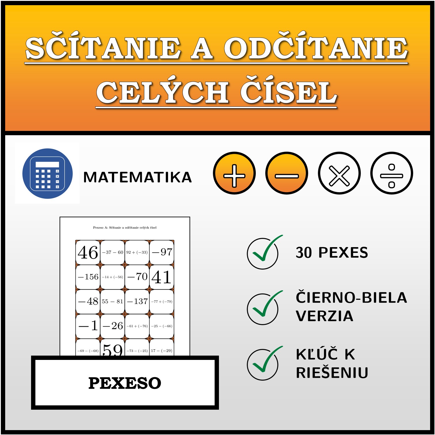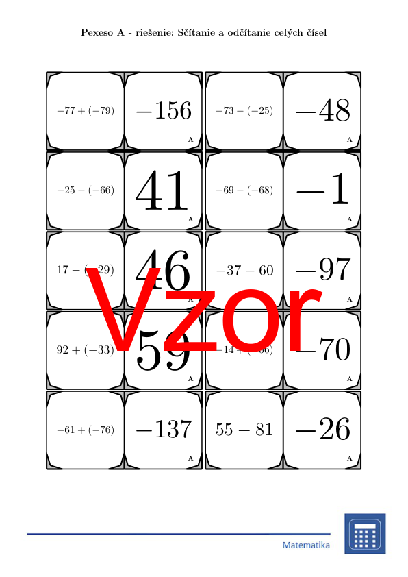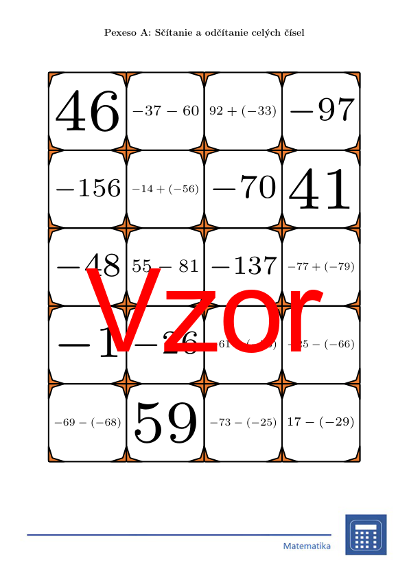 V materiáli sa nachádza celkom 30 sád pexesa na tému sčítanie a odčítanie celých čísel v nasledujúcom usporiadaní: