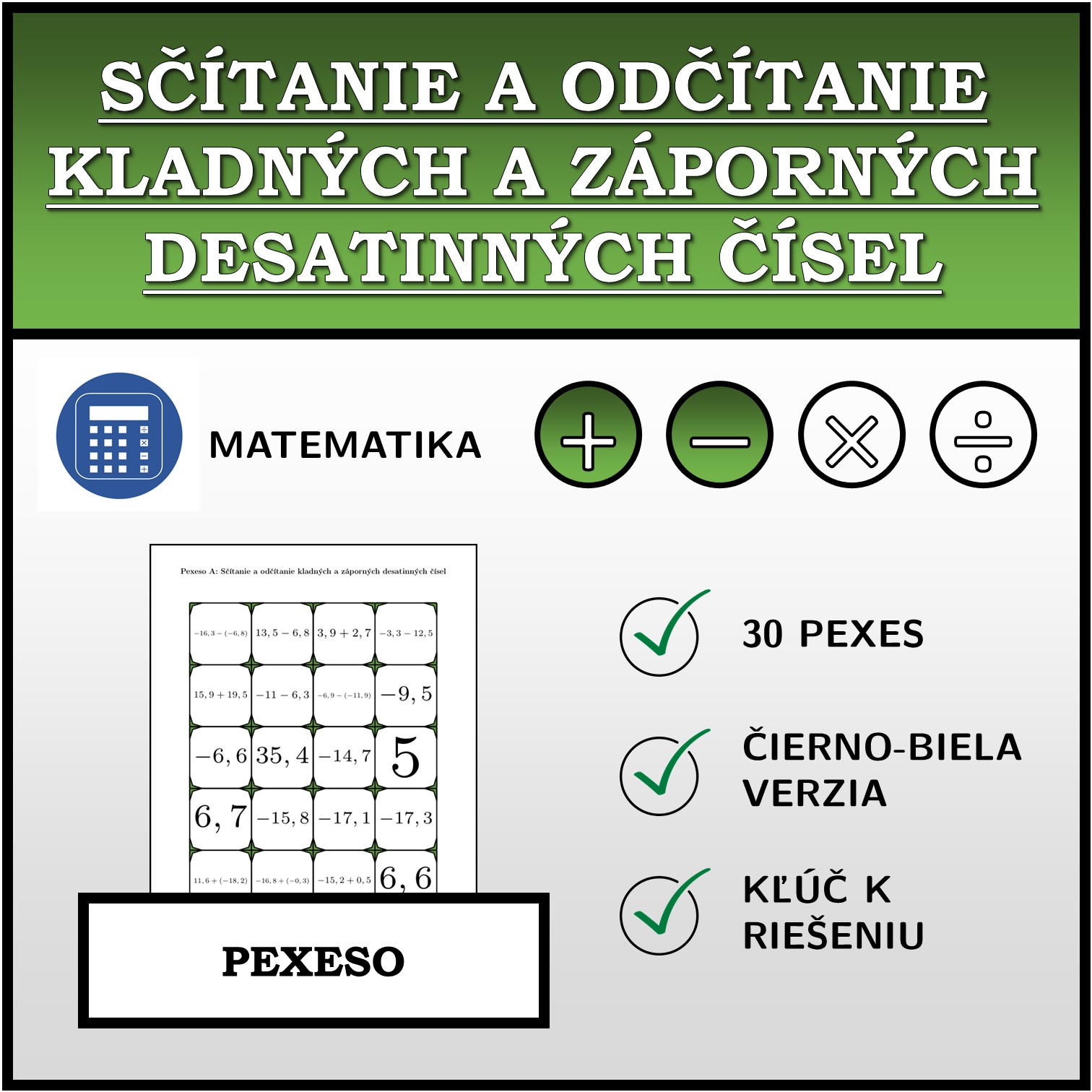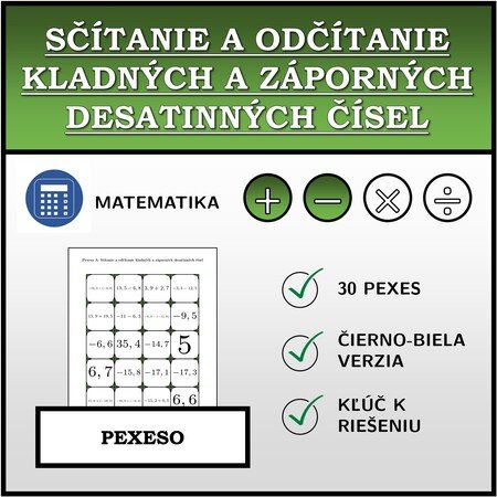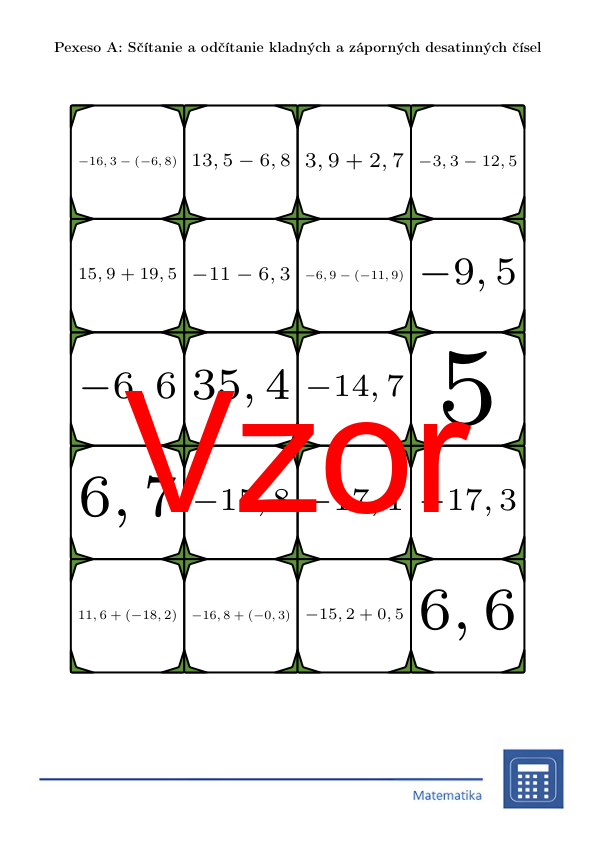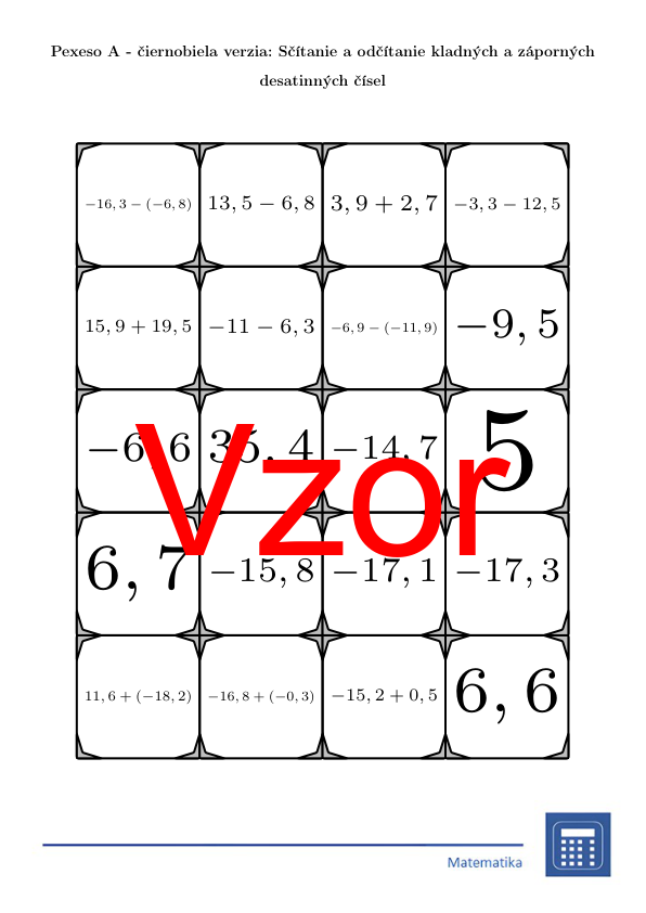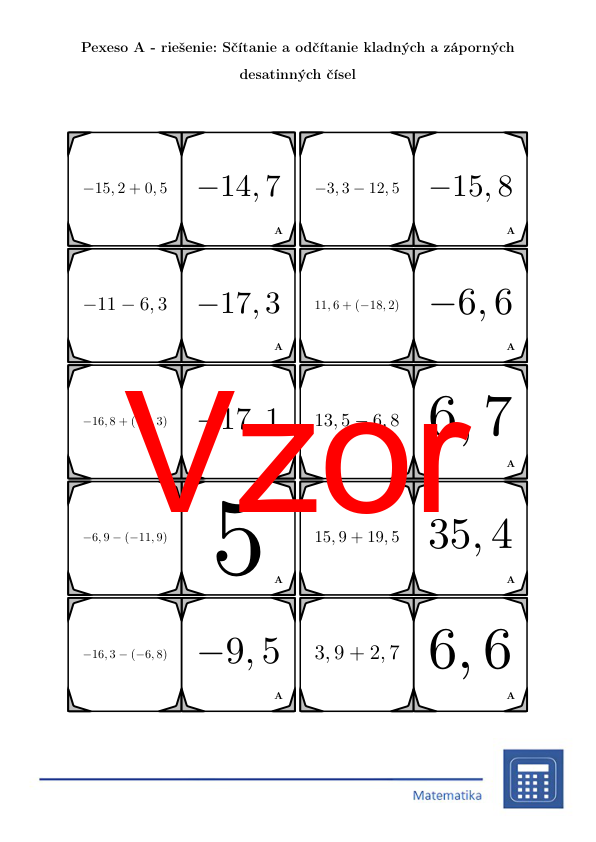 V materiáli sa nachádza celkom 30 sád pexesa na tému sčítanie a odčítanie kladných a záporných desatinných čísel v nasledujúcom usporiadaní:
