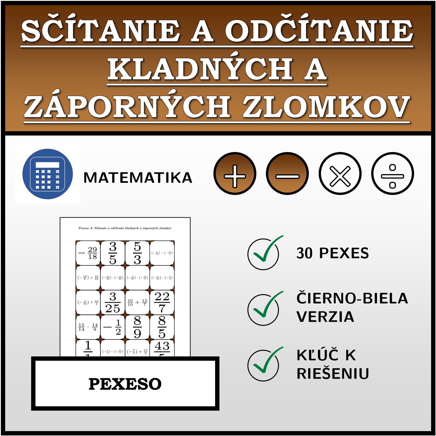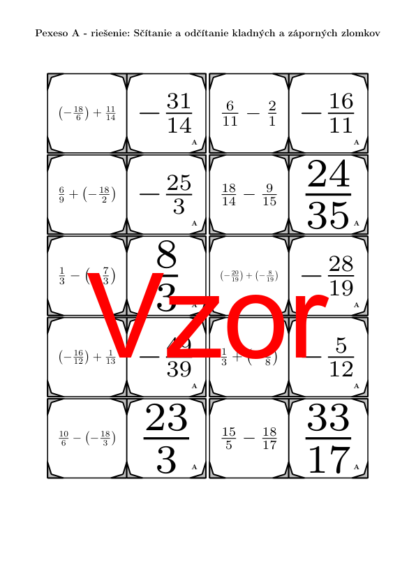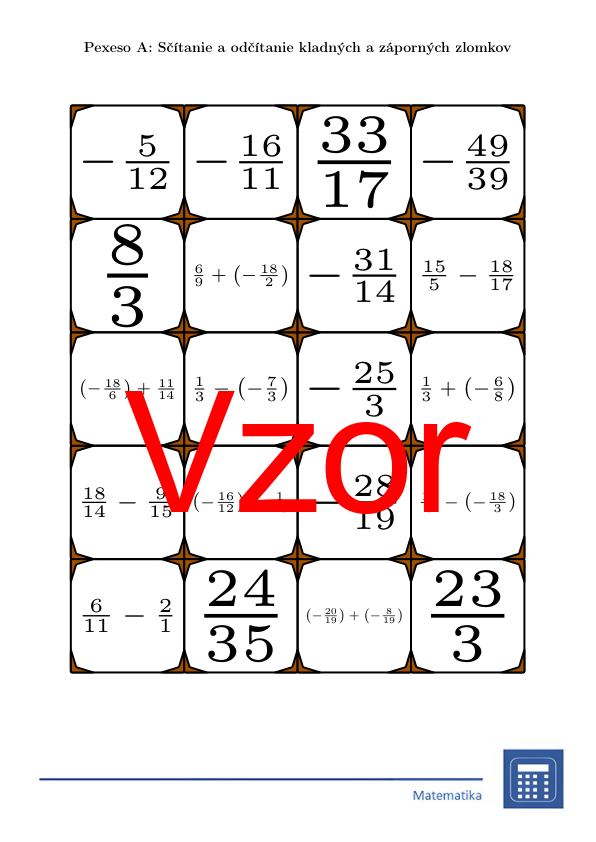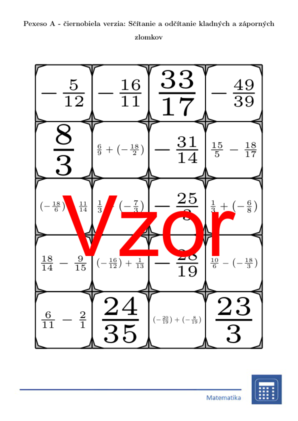 V materiáli sa nachádza celkom 30 sád pexesa na tému sčítanie a odčítanie kladných a záporných zlomkov v nasledujúcom usporiadaní: