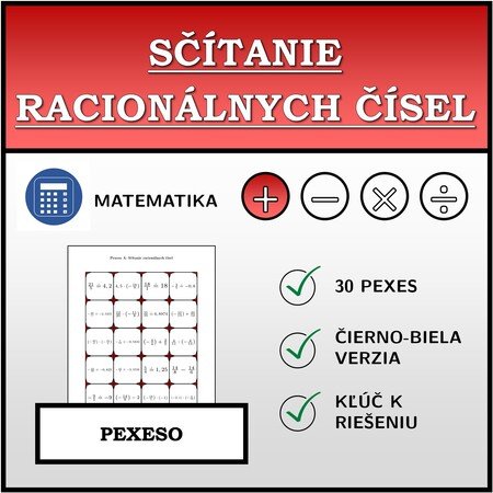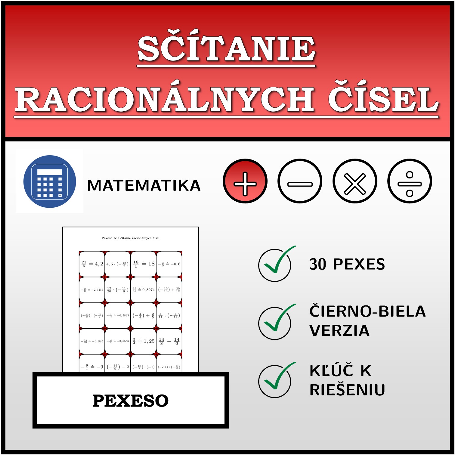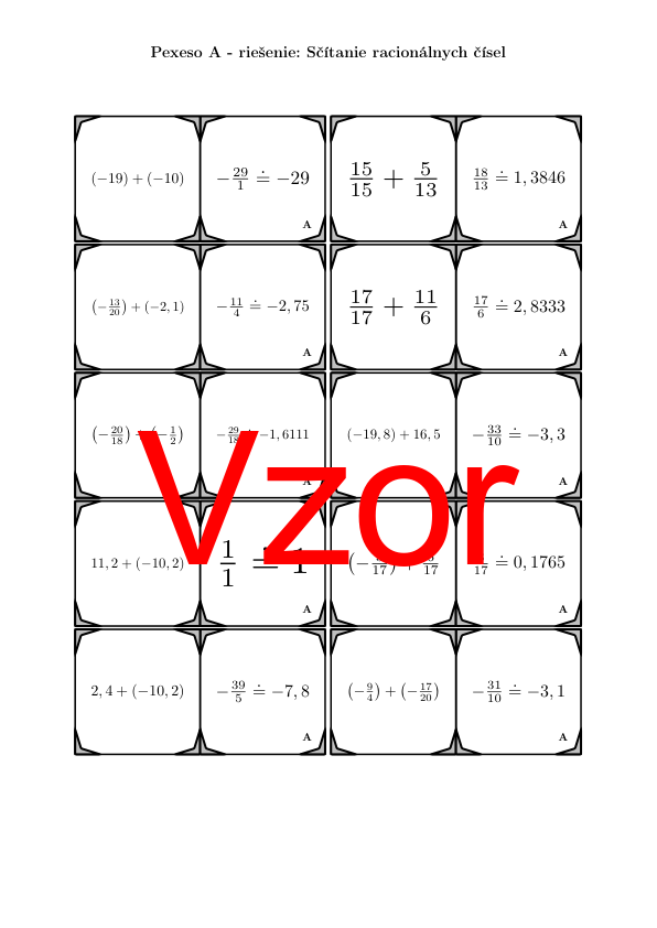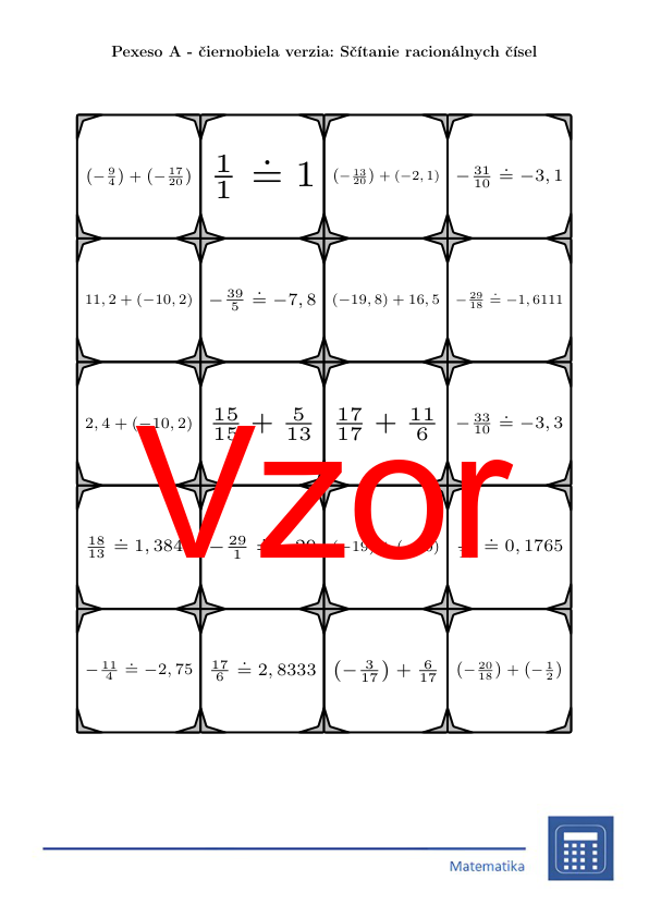 V materiáli sa nachádza celkom 30 sád pexesa na tému sčítanie racionálnych čísel v nasledujúcom usporiadaní: