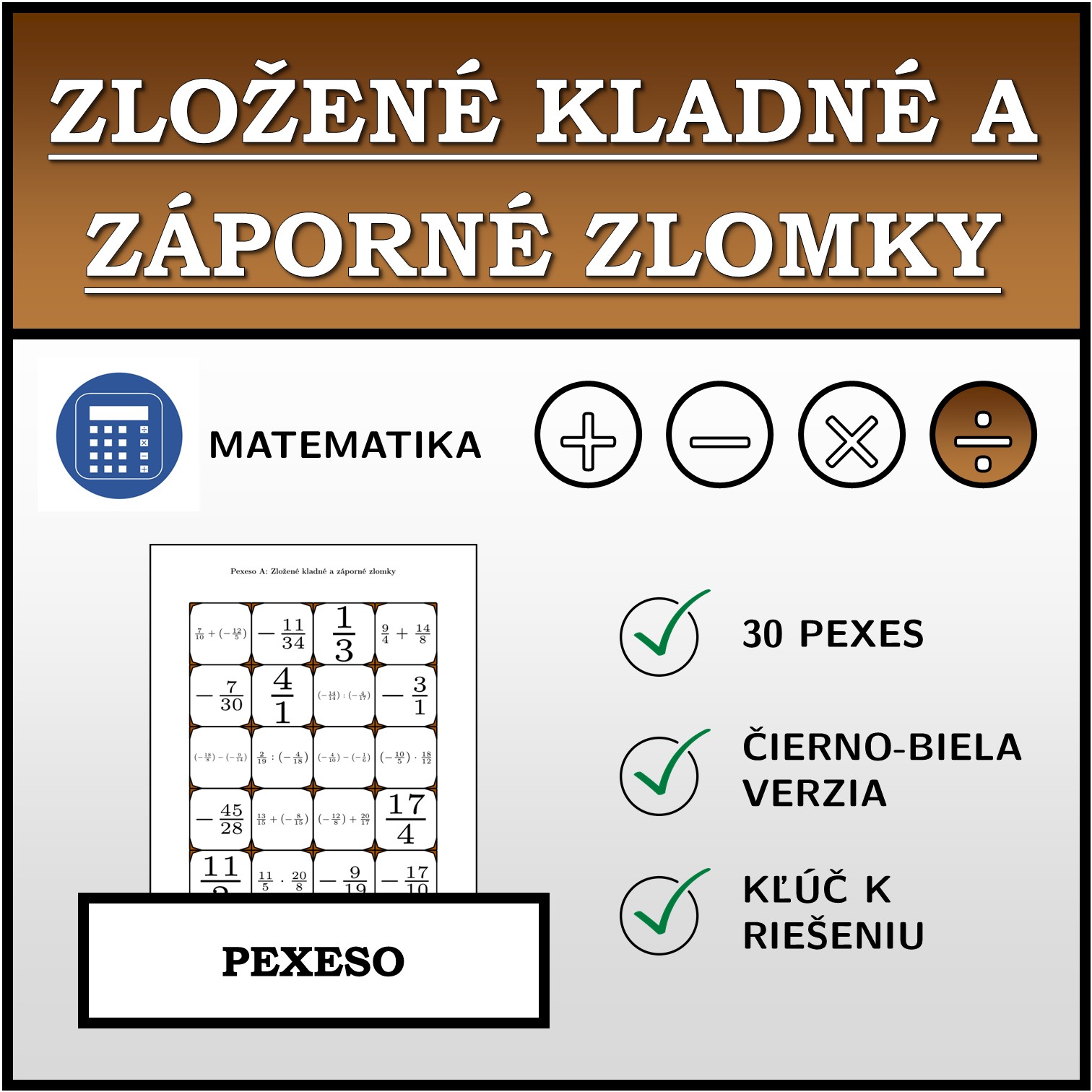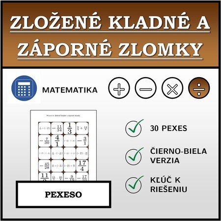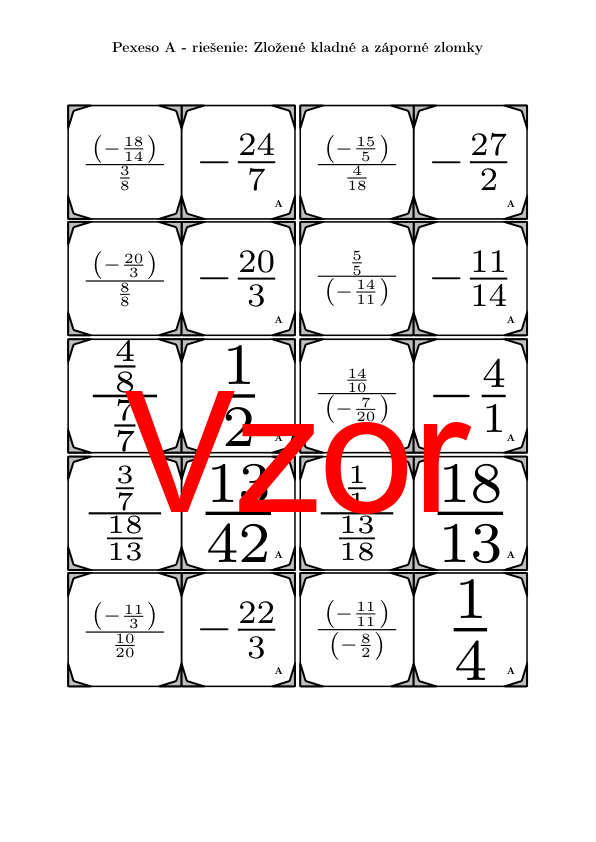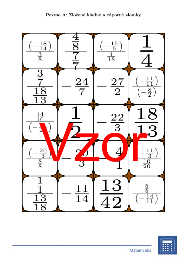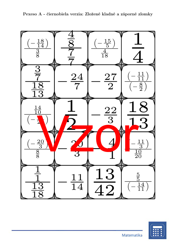 V materiáli sa nachádza celkom 30 sád pexesa na tému zložené kladné a záporné zlomky v nasledujúcom usporiadaní: