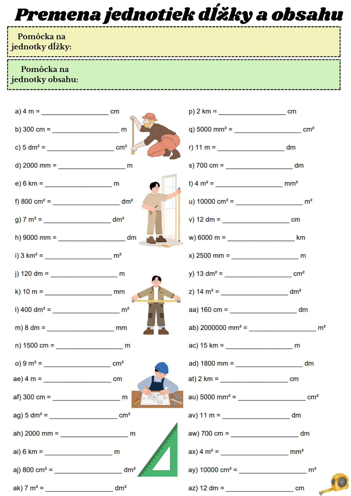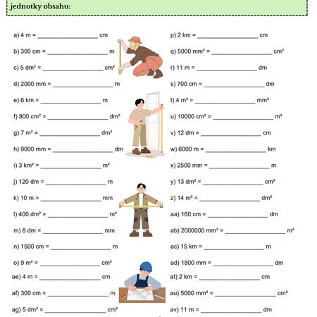 Pracovný list na premenu jednotiek dĺžky a obsahu.