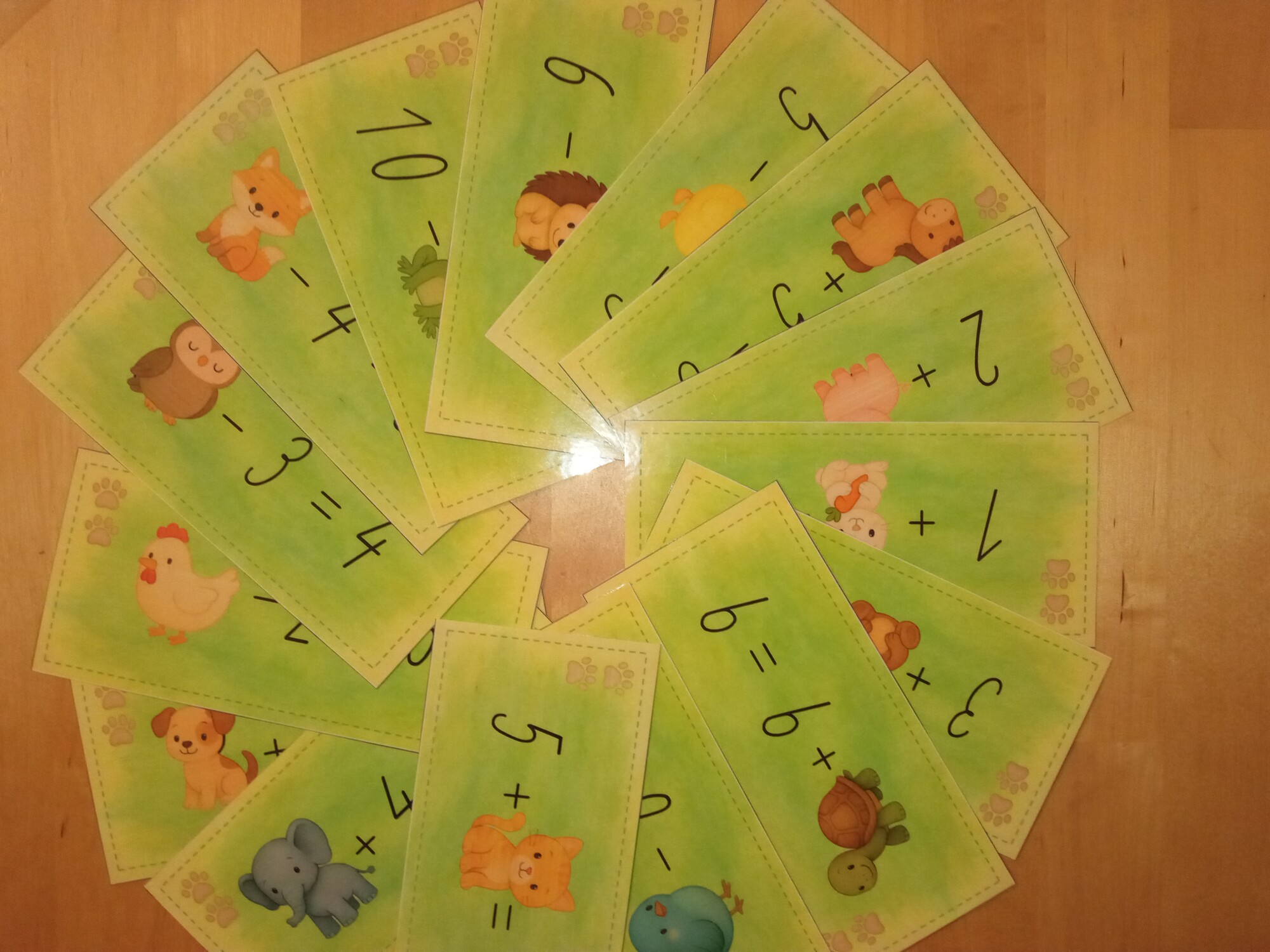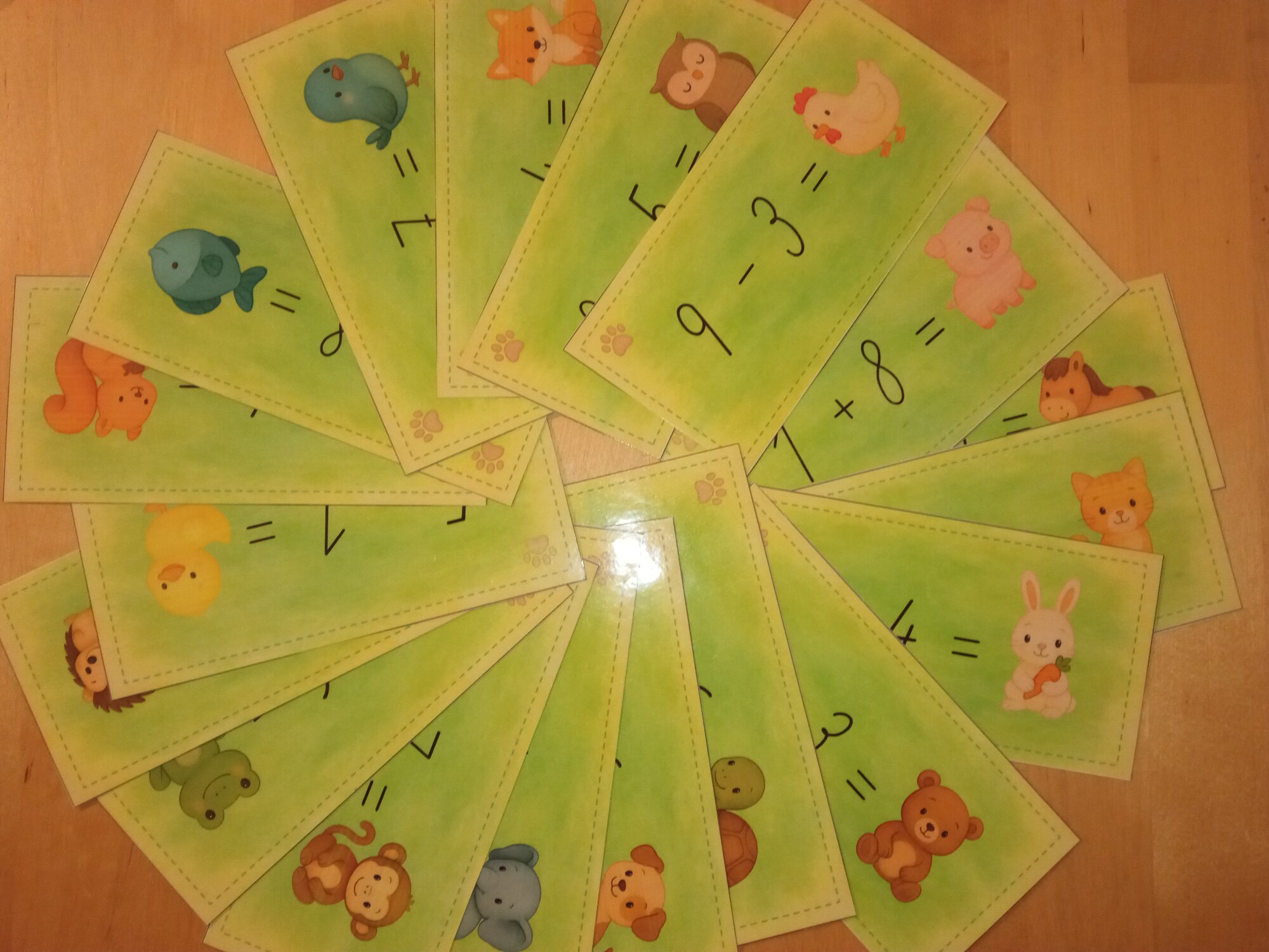 Kartičky s príkladmi rozmiestnime v triede, na chodbe, na záhrade. Deti počítajú a dopisujú čísla do zápisového listu.
