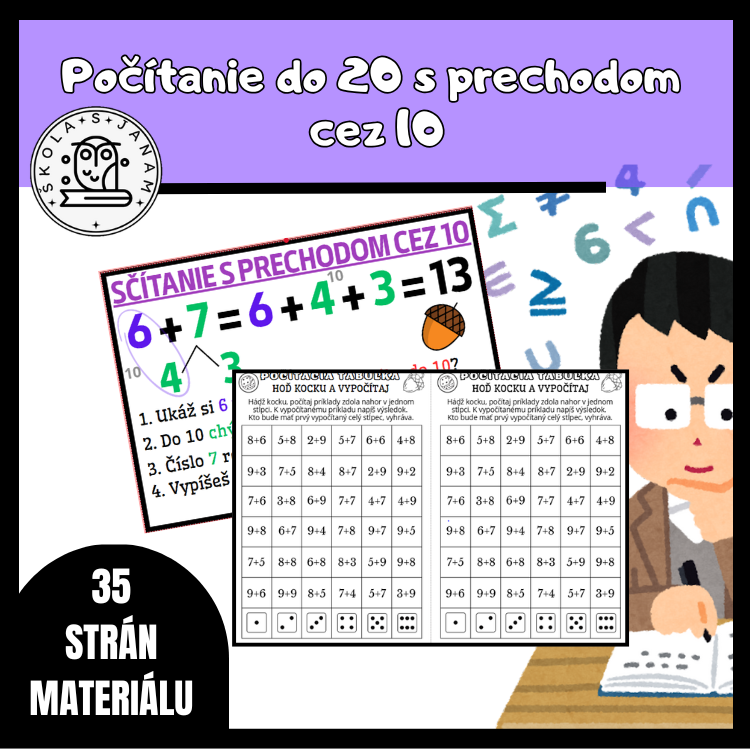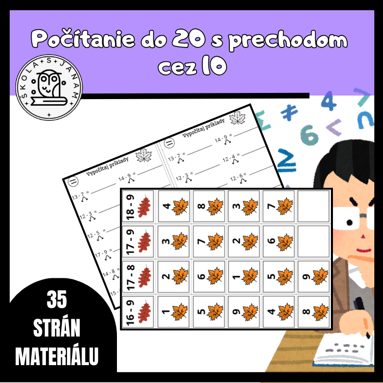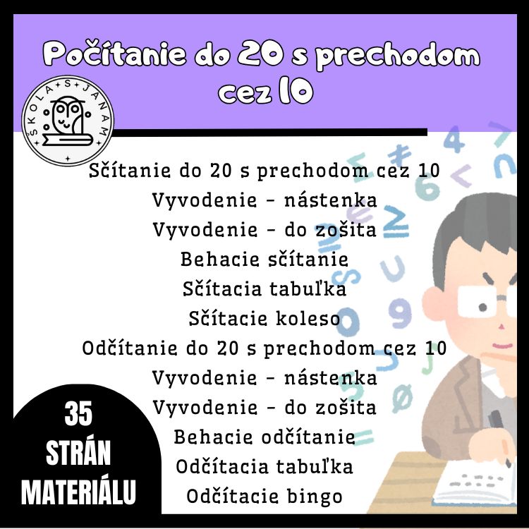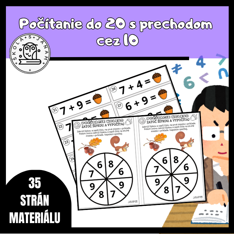 Počítanie do 20 s prechodom cez desiatku. Obsahuje vyvodenie do zošita, vyvodenie na tabuľu, cvičenia a rôzne hry k sčítaniu aj odčítaniu.