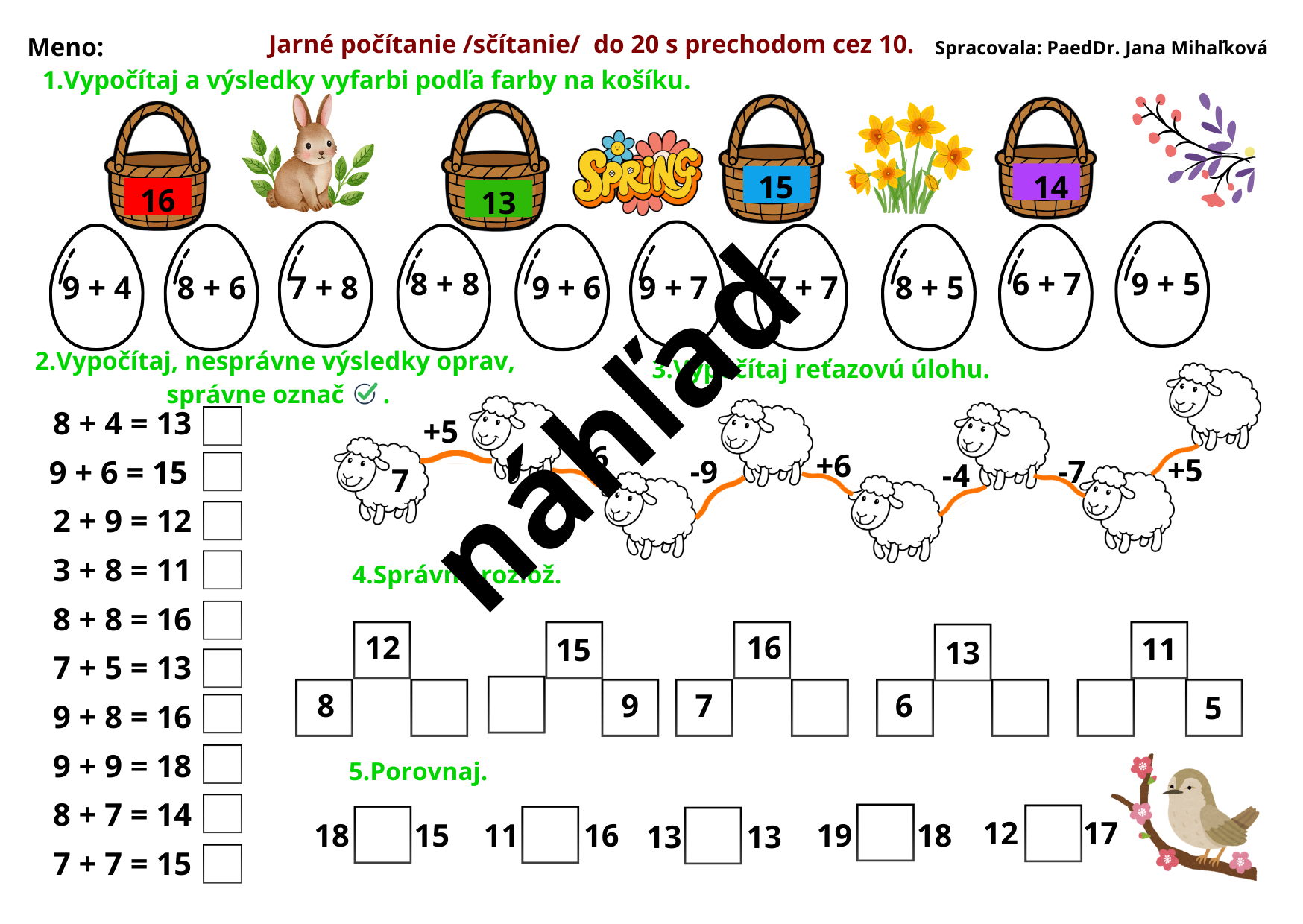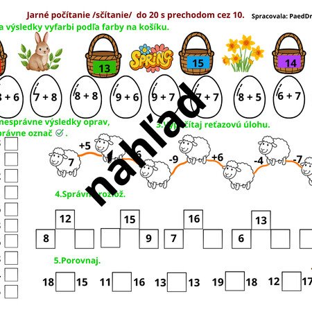 Pracovné listy sú vhodné na precvičenie matematických operácii v číselnom obore do 20. V každom pracovnom liste sú úlohy rôzneho druhu. Tri pracovné listy sú zamerané na počítanie v druhej desiatke bez prechodu. Ostatné sú vhodné na precvičenie počítania s prechodom cez 10. Pracovné listy môže učiteľ použiť na upevnenie učiva, ale aj ako domácu úlohu na precvičenie. Odporúčam vytlačiť farebne.