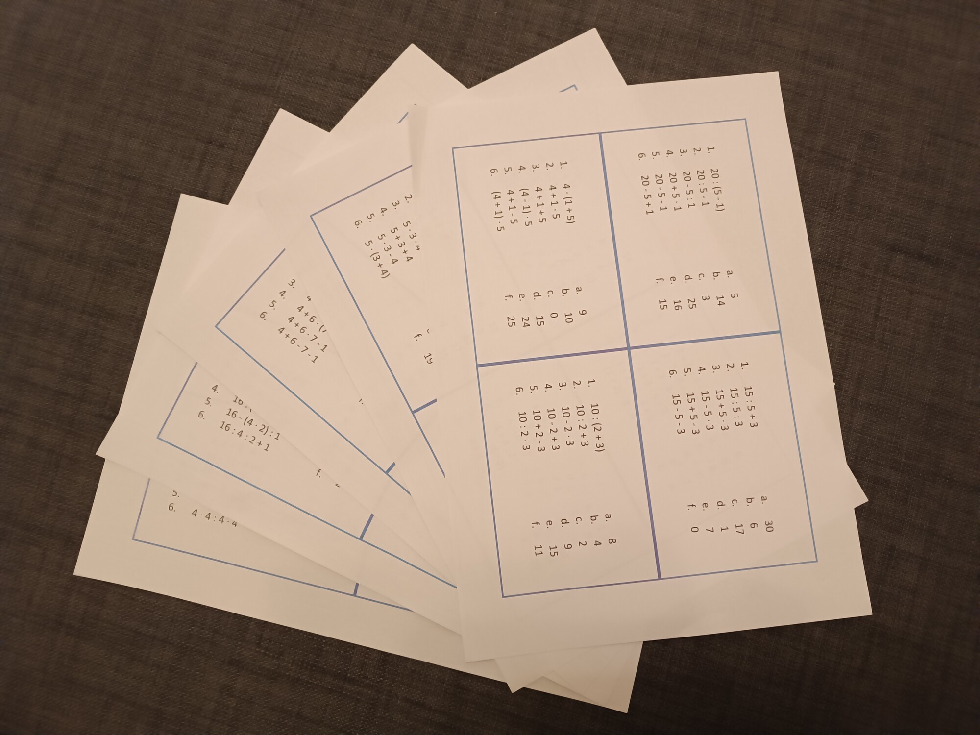Aktivita slúži na precvičenie základných početných operácií a ich poradie (zátvorky, násobenie, delenie, sčítanie, odčítanie). Žiaci majú za úlohu vypočítať príklady v ľavom stĺpci a priradiť k nim odpovede z pravého stĺpca. Žiaci teda spájajú príklad s výsledkom (napr. 1b, 2e, …) a zapisujú buď do zošita, alebo mazacou fixkou na priložené odpoveďové „hároky“. Potom skontrolujú otočením karty. Obsahuje 20 kariet po 6 príkladoch. Môžeme tiež vytlačiť a každému žiakovi dať kartu na nalepenie do zošita a vypracovania.