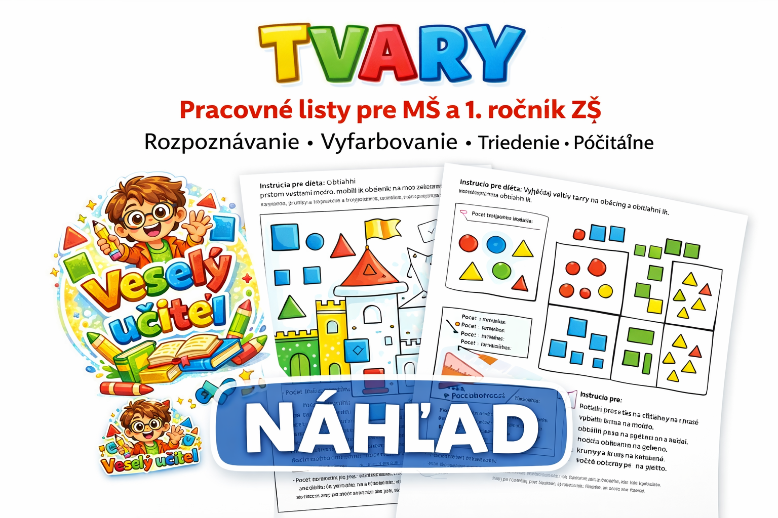 Pracovný list je zameraný na rozvoj predmatematických predstáv u detí predškolského veku. Cieľom je upevňovanie poznatkov o základných geometrických tvaroch (kruh, štvorec, obdĺžnik, trojuholník), rozvoj zrakového vnímania, pozornosti, jemnej motoriky a orientácie na ploche.