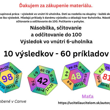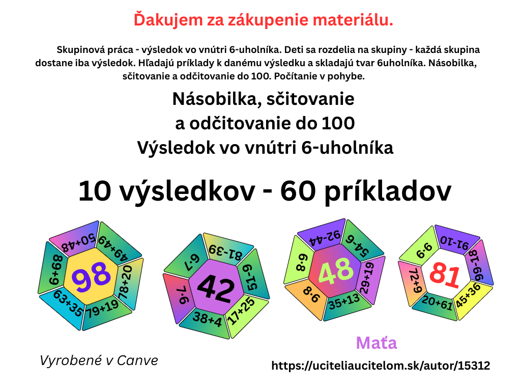 Skupinová práca - výsledok vo vnútri 6-uholníka. Deti sa rozdelia na skupiny - každá skupina dostane iba výsledok. Hľadajú príklady k danému výsledku a skladajú tvar 6uholníka. Násobilka, sčitovanie a odčitovanie do 100. Počítanie v pohybe.