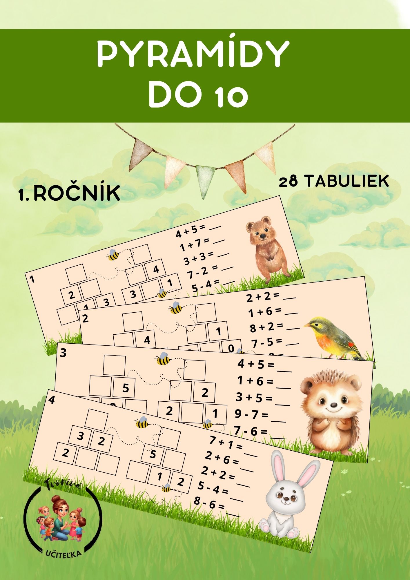 Materiál obsahuje tabuľky s pyramídami a príkladmi na sčítanie a odčítanie do 10 v 1. ročníku.