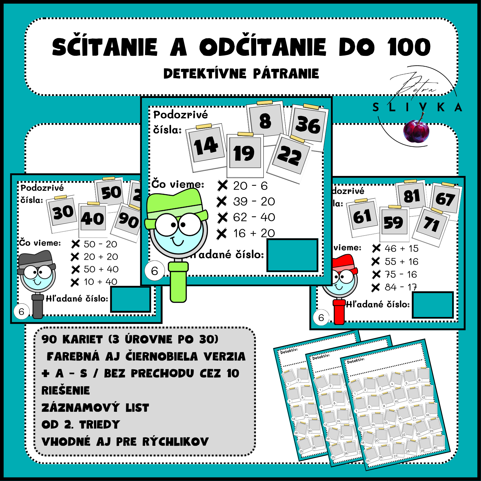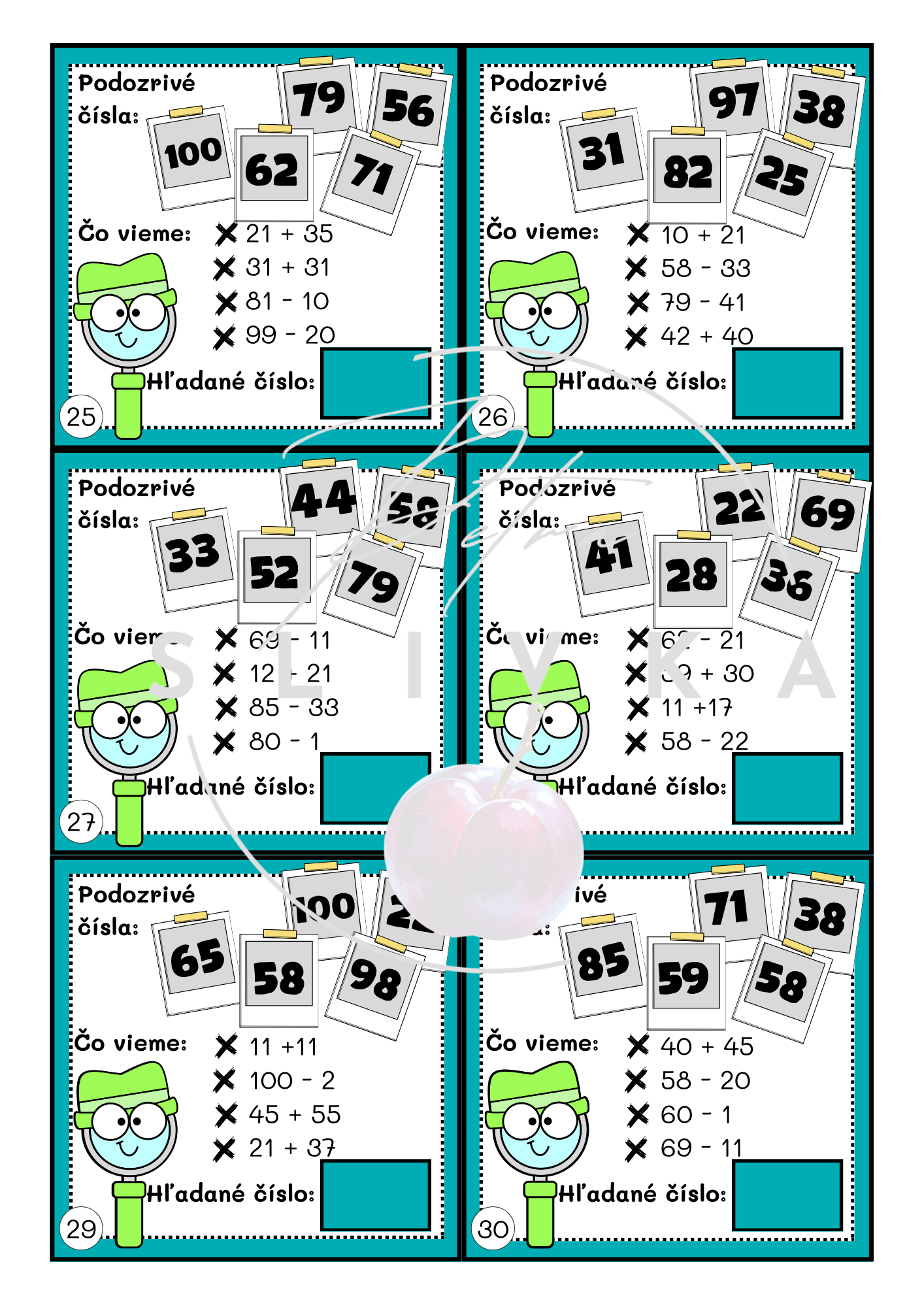 30 kariet sčítania a odčítania do 100 – úroveň 2 (sčítanie a odčítanie bez prechodu cez desiatky) – farebná aj čiernobiela verzia