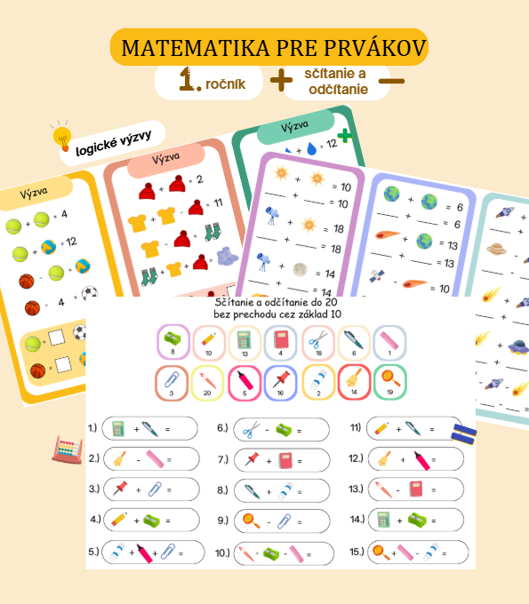 Súbor aktivít pre prvákov, ktorí si potrebujú precvičiť sčítanie a odčítanie. Deti pracujú s obrázkami namiesto čísiel, dopĺňajú číselné hodnoty a riešia príklady zábavnou formou.