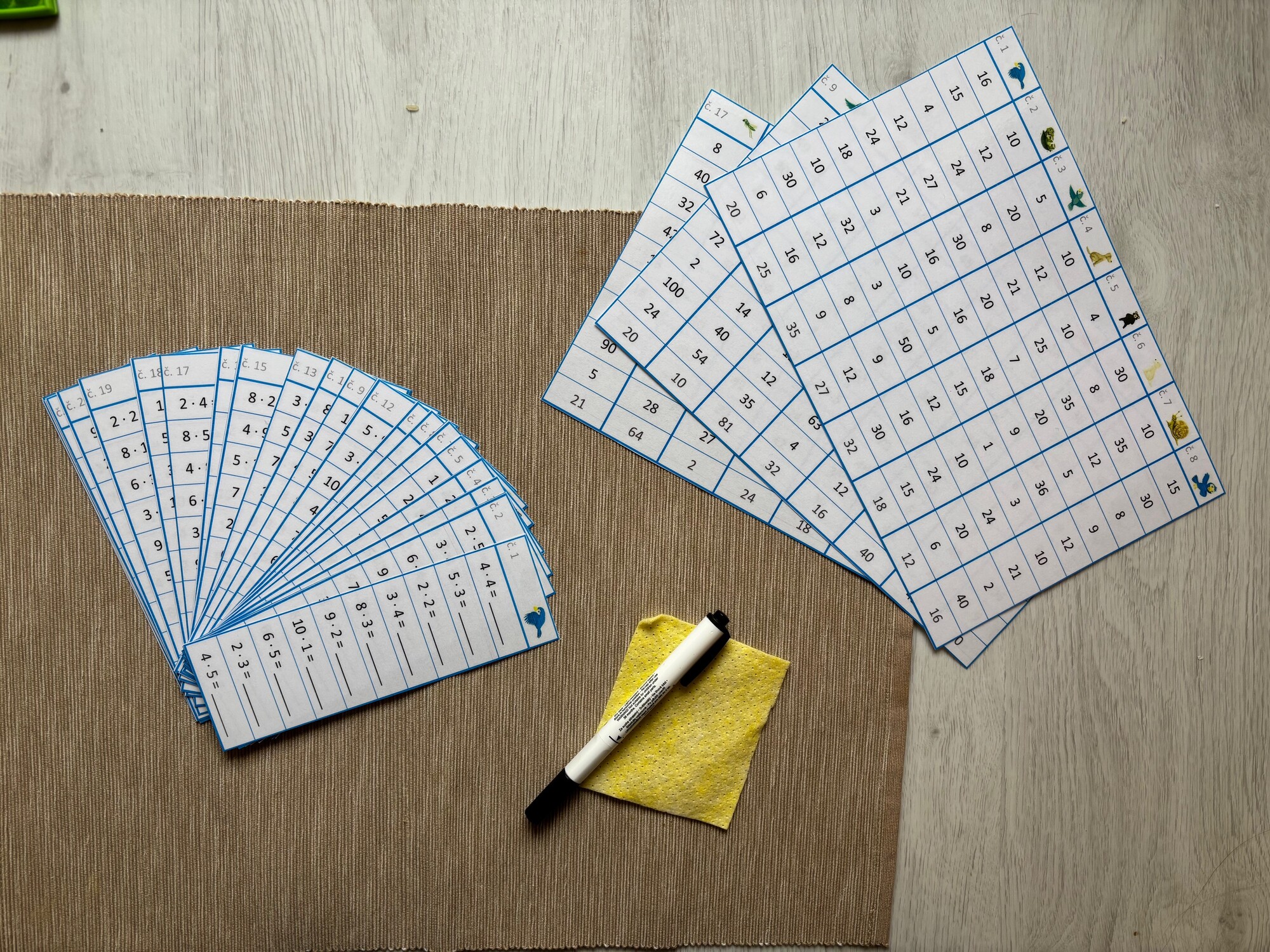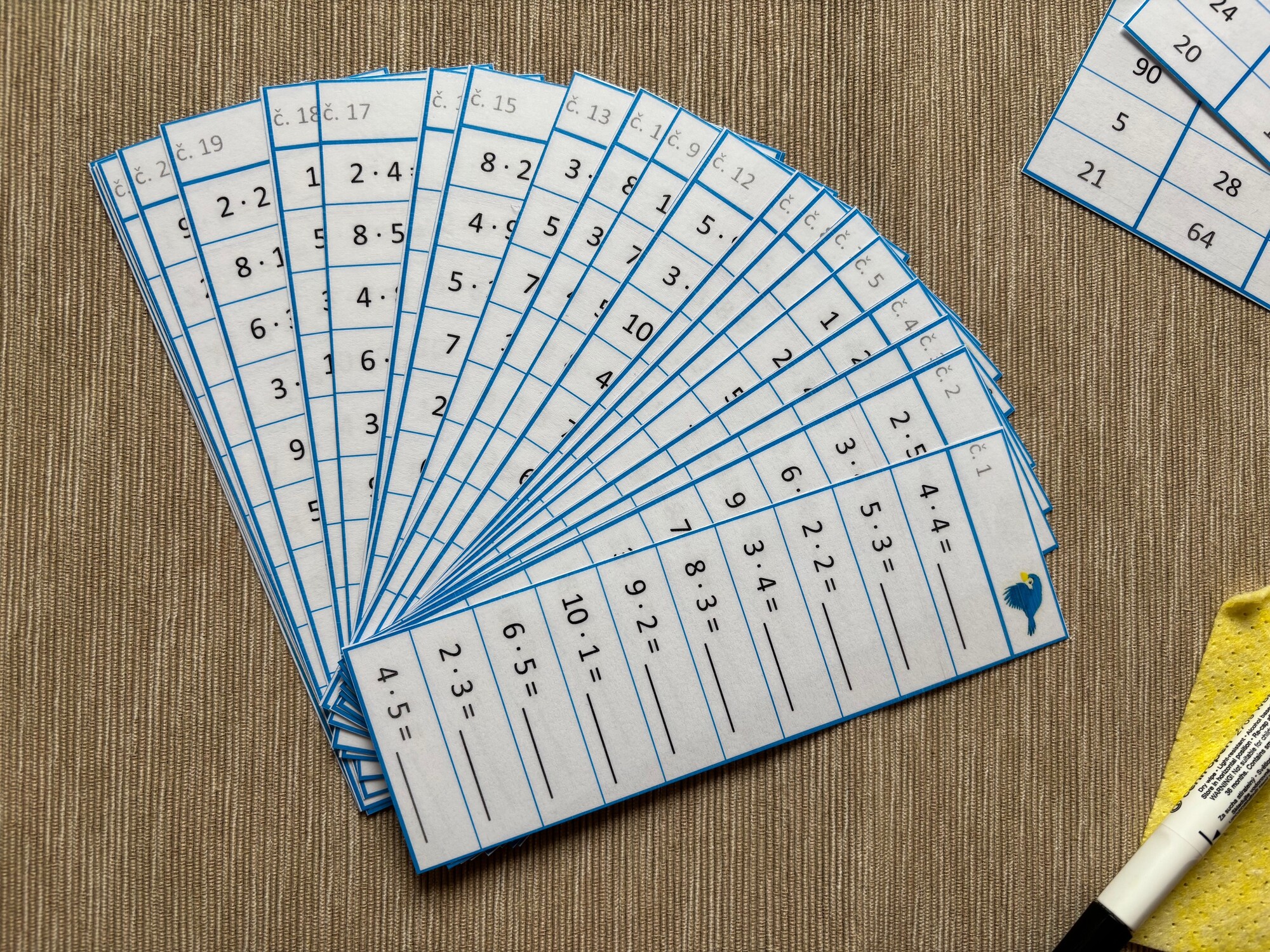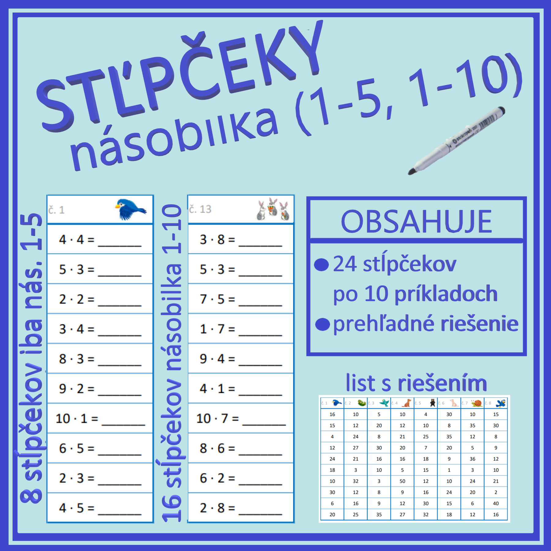 Jednoduchá aktivita na rýchle a efektívne precvičenie násobilky. Prvá časť (8 stĺpčekov) obsahuje príklady z násobilky 1-5, zvyšok príkladov (16 stĺpčekov) je mix násobilky 1-10. Materiál má niekoľko možností využitia, je možné vytlačiť ako pracovné listy, prípadne vytlačiť, zalaminovať a používať ako jednotlivé stĺpčeky s mazacou fixkou. Obsahuje 24 stĺpčekov, v každom je 10 príkladov, celkom teda 240 príkladov. Vrátane prehľadného riešenia vo forme tabuľky na jednoduchú kontrolu.
