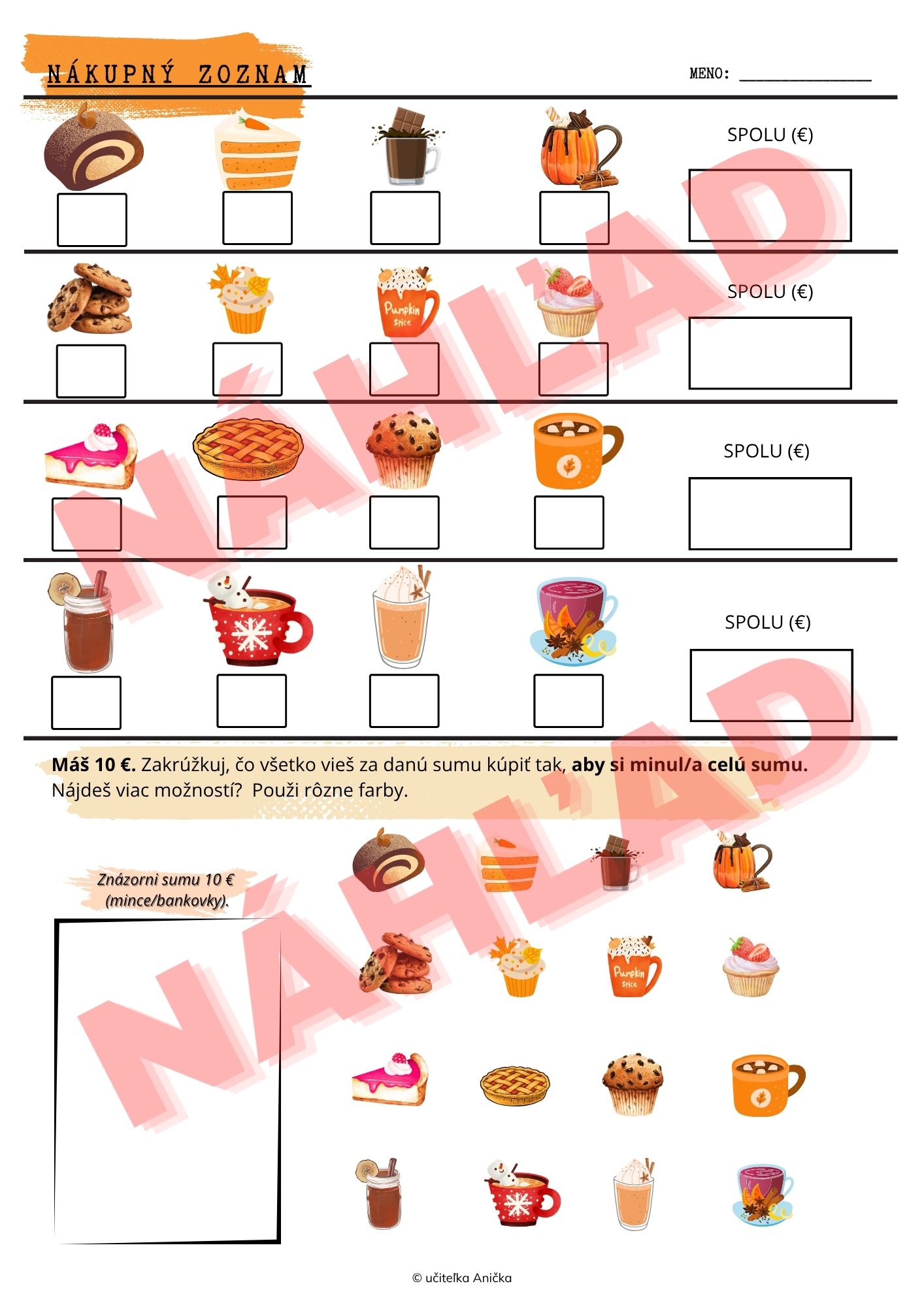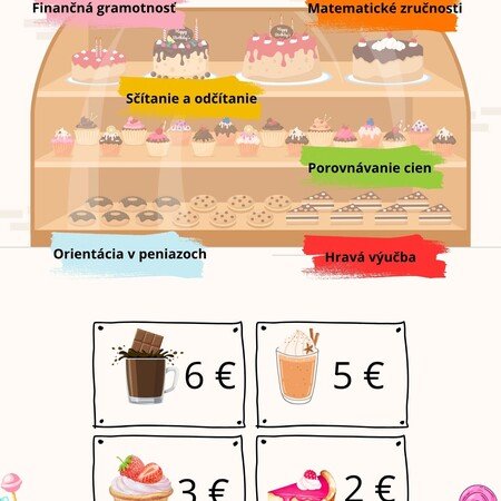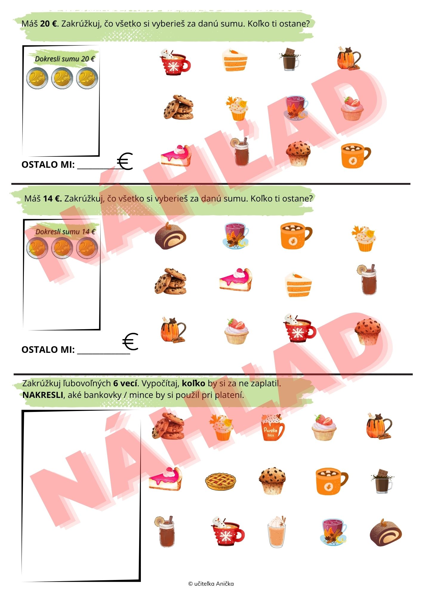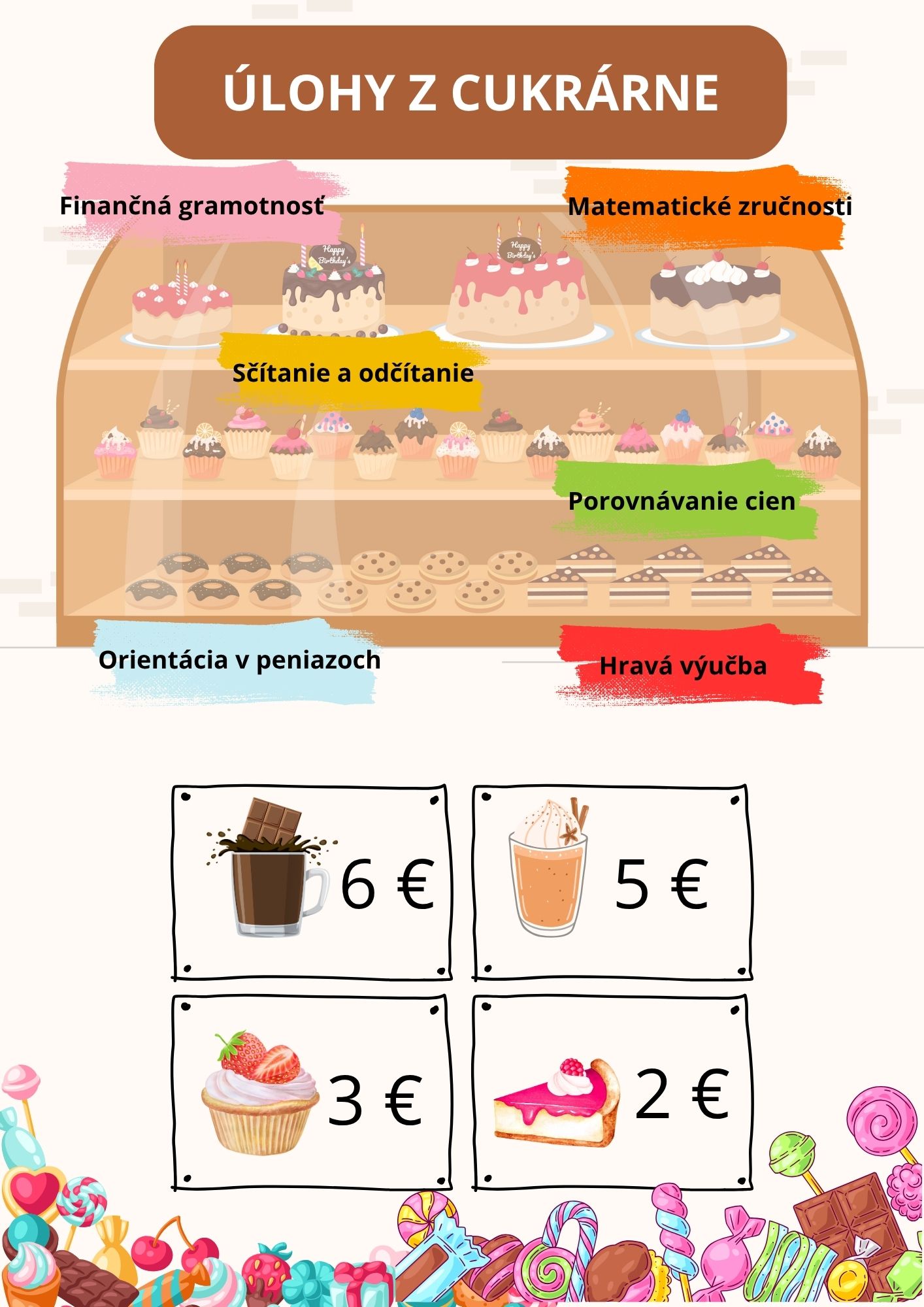Pracovné listy „Úlohy z cukrárne“ hravou formou spájajú počítanie do 20 s prvkami finančnej gramotnosti. Žiaci sa „pohybujú po cukrárni“, zisťujú ceny koláčikov a nápojov a riešia úlohy so sčítaním, odčítaním a porovnávaním. Materiál rozvíja matematické zručnosti, orientáciu v peniazoch a podporuje samostatnosť a aktivitu žiakov. Je vhodný pre 1. stupeň ZŠ (1. a 2. ročník), dá sa realizovať individuálne alebo skupinovo a je možné ho prispôsobiť podľa úrovne triedy. Pre väčšiu interaktivitu odporúčam zapojiť manipulatívne peniaze, aby si žiaci mohli aj „platiť“ a precvičiť praktické nakupovanie.