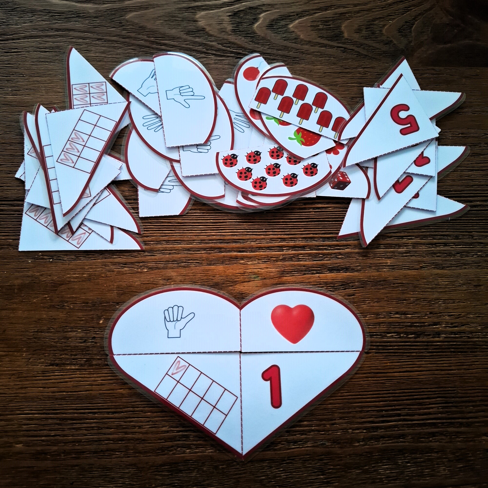 10 srdiečok rozdelených na 4 časti na upevnenie základných matematických operácií súvisiacich s množstvom