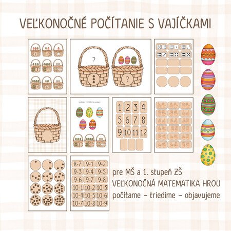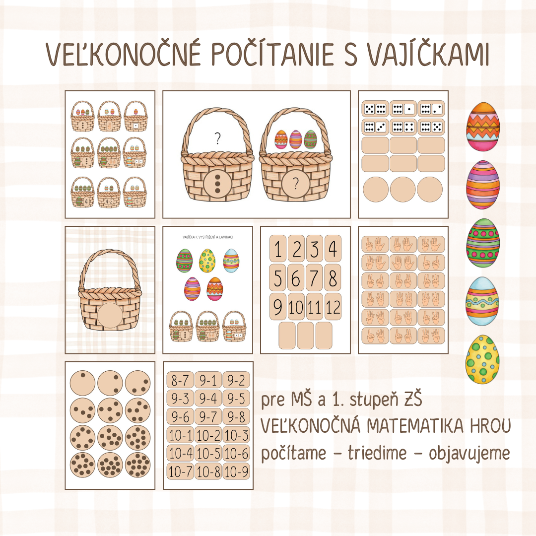 Súbor prepája veľkonočnú tému s rozvojom matematických predstáv, logického myslenia aj jemnej motoriky. Deti sa prirodzenou formou učia počítať, pracovať s množstvom, triediť, porovnávať aj orientovať sa v priestore. Vďaka rôznym úrovniam náročnosti je materiál vhodný pre predškolákov aj pre deti na 1. stupni ZŠ. Aktivity sa dajú ľahko prispôsobiť veku, schopnostiam aj aktuálnym potrebám detí – od jednoduchého triedenia až po sčítanie a odčítanie.