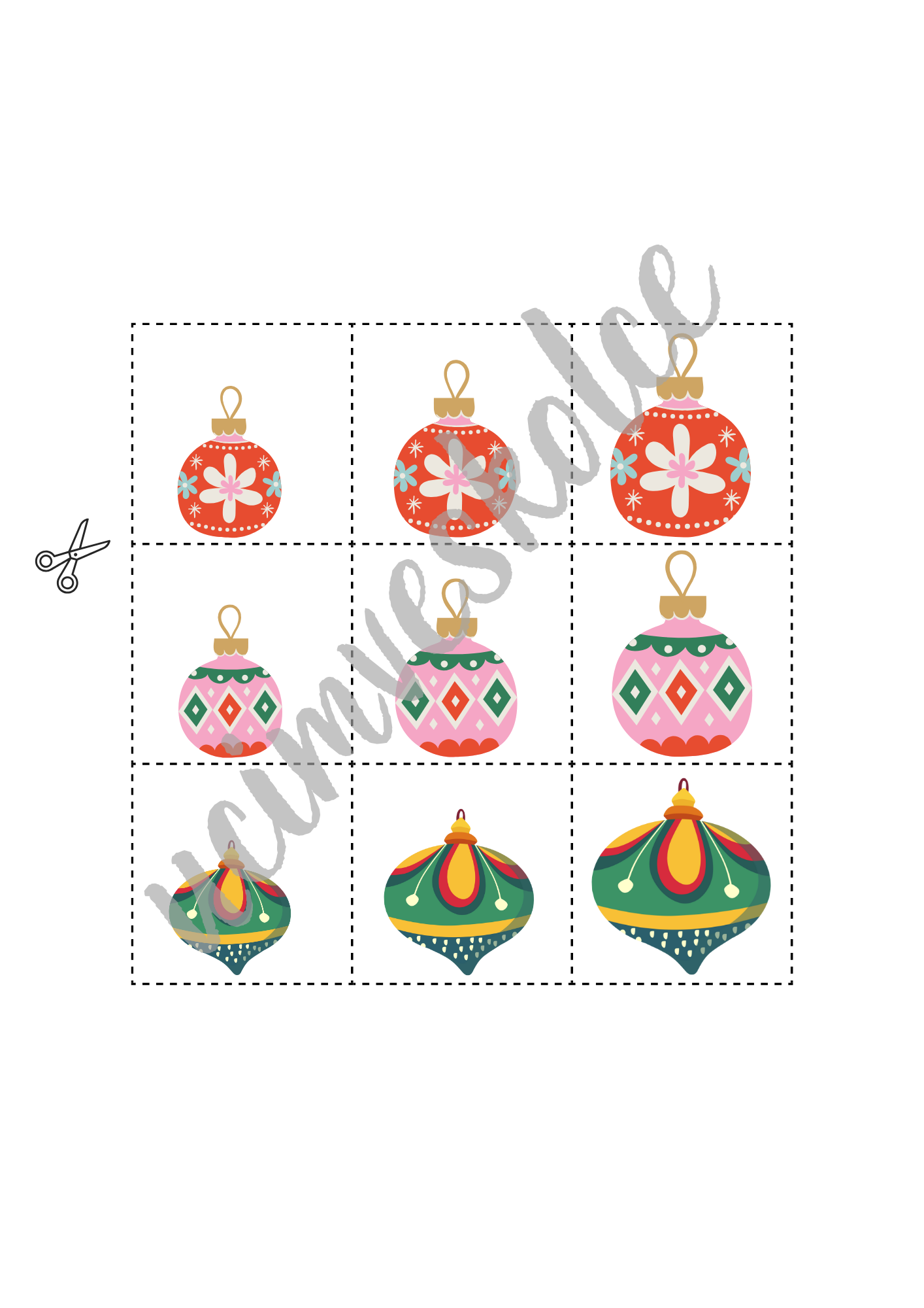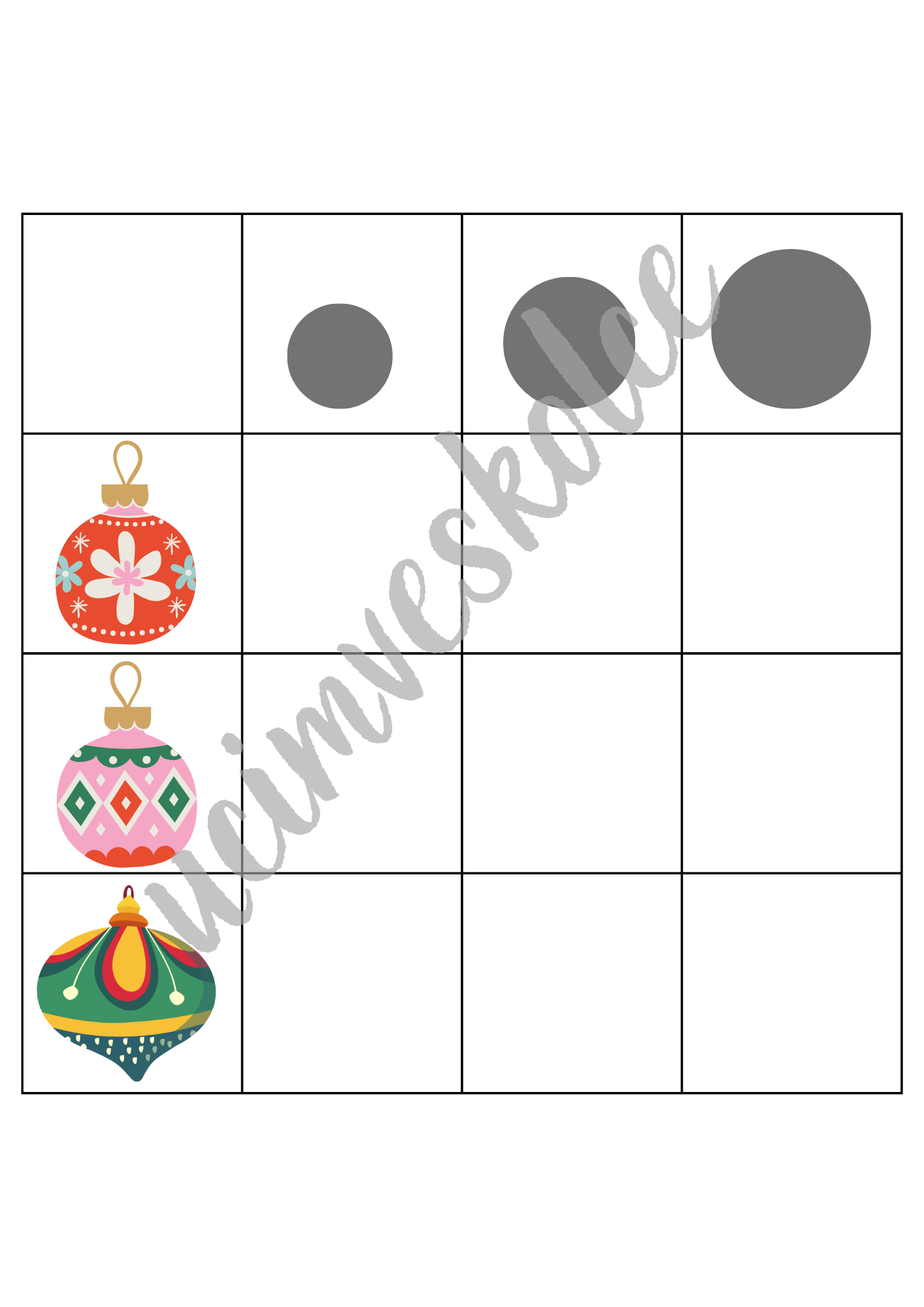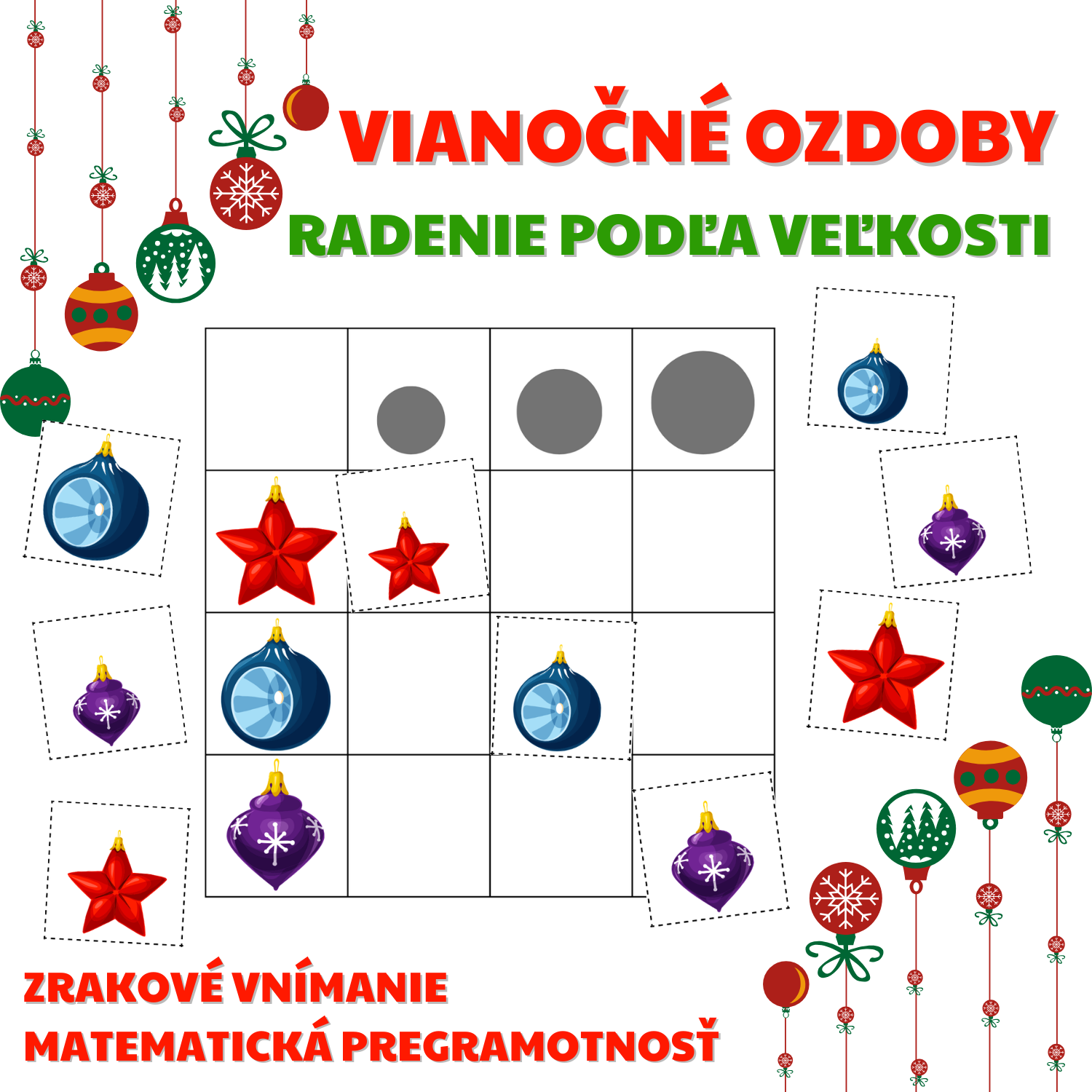 Súbor "VIANOČNÉ OZDOBY - radenie podľa veľkosti" obsahuje 10 tabuliek + 90 kartičiek s obrázkami určených na rozvoj matematickej pregramotnosti.