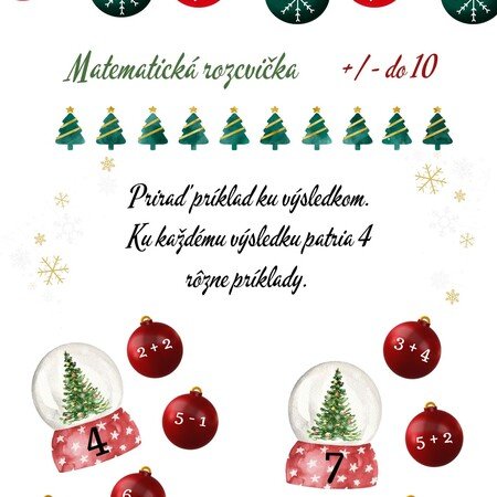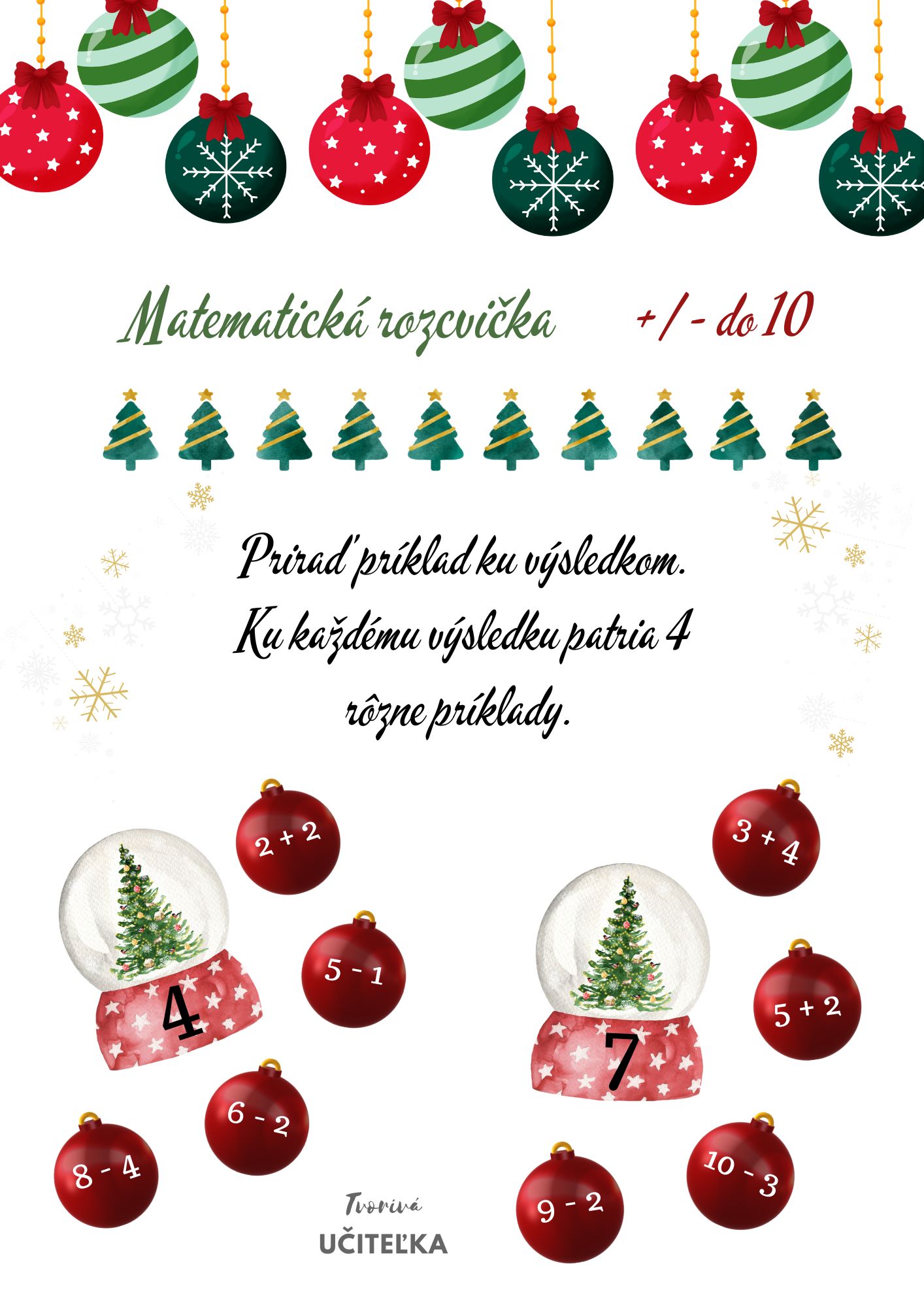 Obsah:Materiál obsahuje 40 príkladov na +/- do 10.Aktivita:Materiál je vhodné vytlačiť a zalaminovať.Úlohou žiakov je priradiť príklad vianočnú gulu ku snehovej guli, ktorá má výsledok.