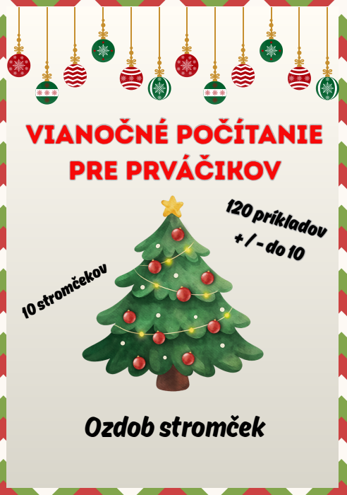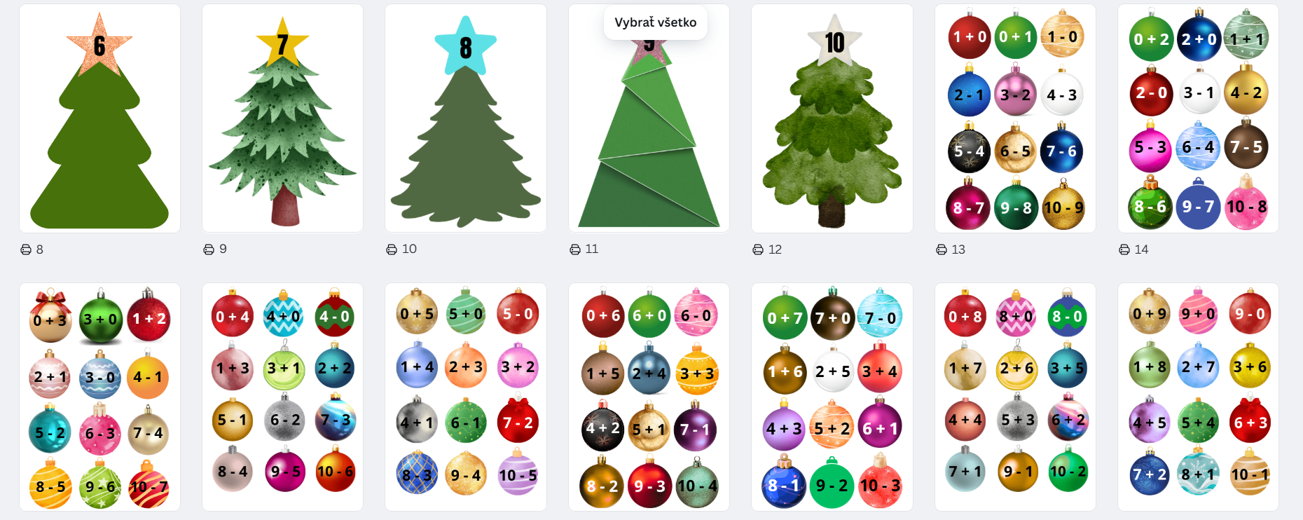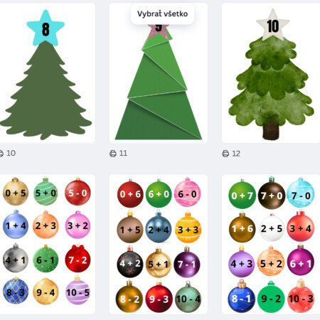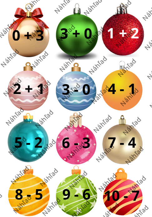 Materiál obsahuje stromčeky s výsledkami od 1 do 10 a k nim 120 vianočných gúľ s príkladmi na sčítanie a odčítanie.