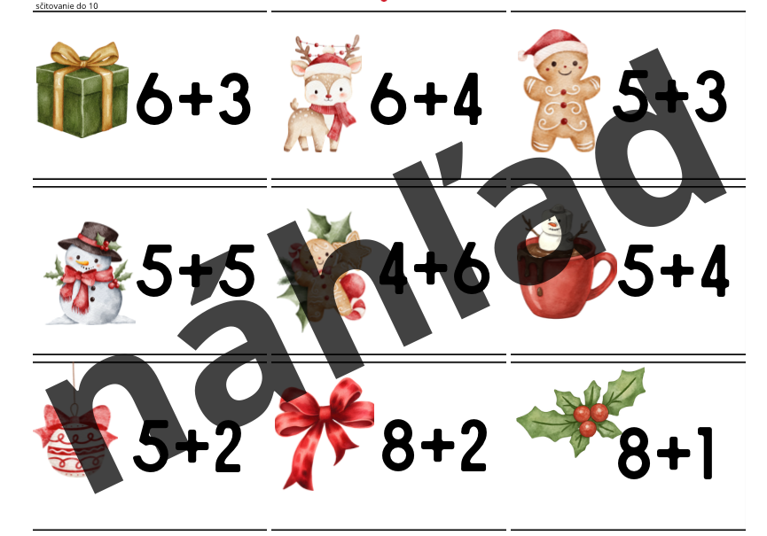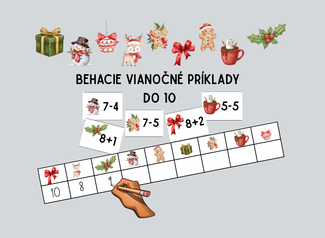 Prineste do svojej triedy viac pohybu, radosti a sviatočnej atmosféry. Behacie vianočné príklady do 10 sú navrhnuté tak, aby žiakov motivovali k aktívnemu učeniu bez stresu a drilu. Deti sa pri nich prirodzene hýbu, riešia jednoduché príklady a zároveň si upevňujú sčítanie a odčítanie v obore do desať. Materiál ponúka 36 precvičovacích príkladov. Súčasťou sú aj prázdne políčka, do ktorých môžete dopísať vlastné príklady podľa aktuálnych potrieb vašej triedy.