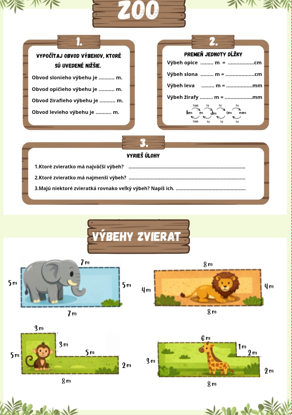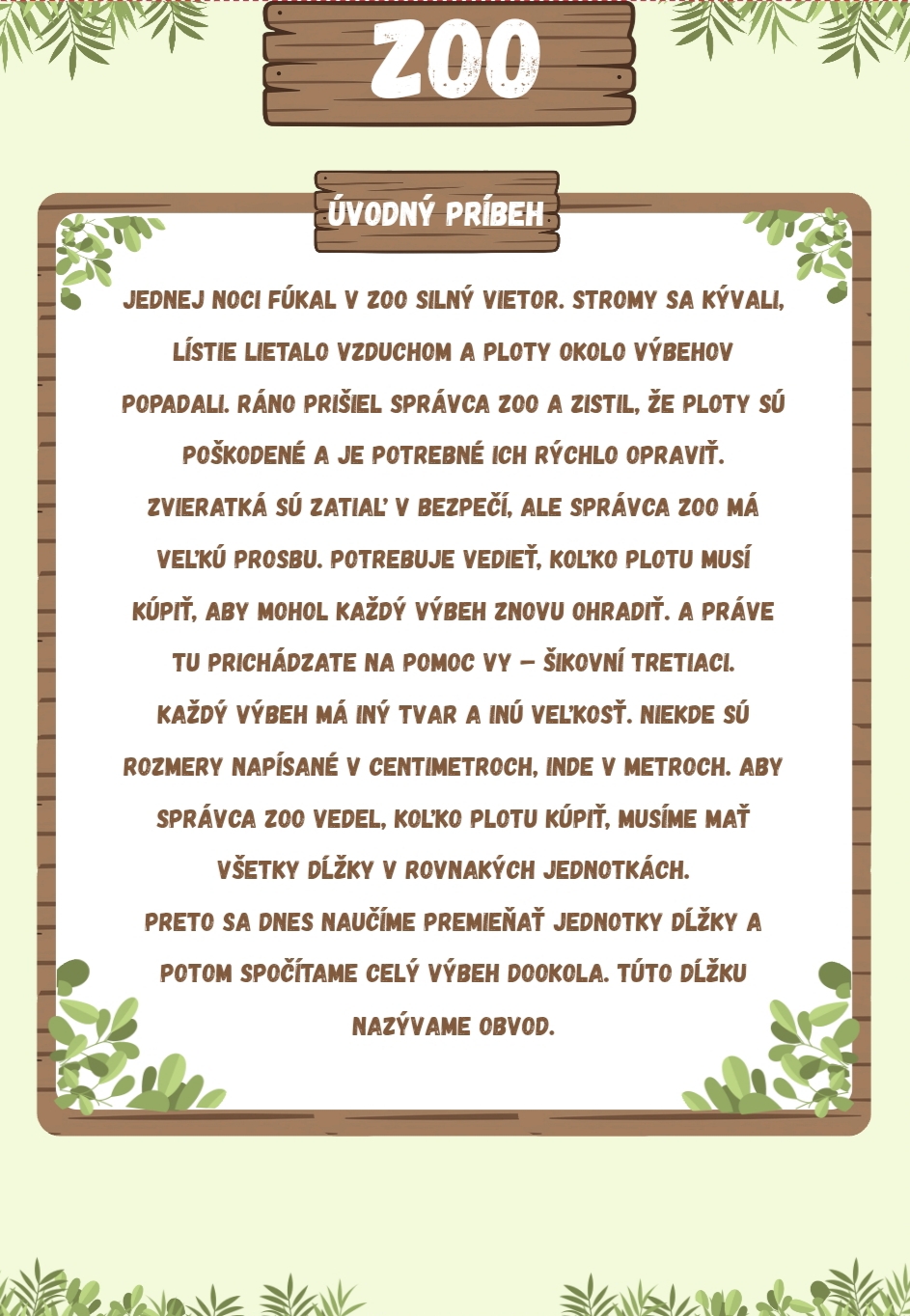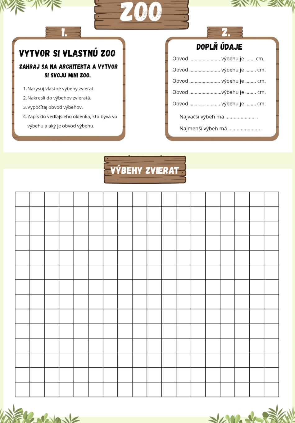 Séria pracovných listov s názvom (ZOO / Pracuj v ZOO) je zameraná na pochopenie, vyvodenie a upevňovanie pojmu obvod a na premenu jednotiek dĺžky. Pracovné listy sú spracované tvorivou a zážitkovou formou, ktorá žiakov motivuje aktívne pracovať, premýšľať a uplatňovať matematické poznatky v praktických situáciách. Pracovné listy sú vhodné na vyvodenie učiva, precvičovanie aj upevňovanie učiva. Materiál je určený pre 3. ročník základnej školy v rámci predmetu matematika – geometria.