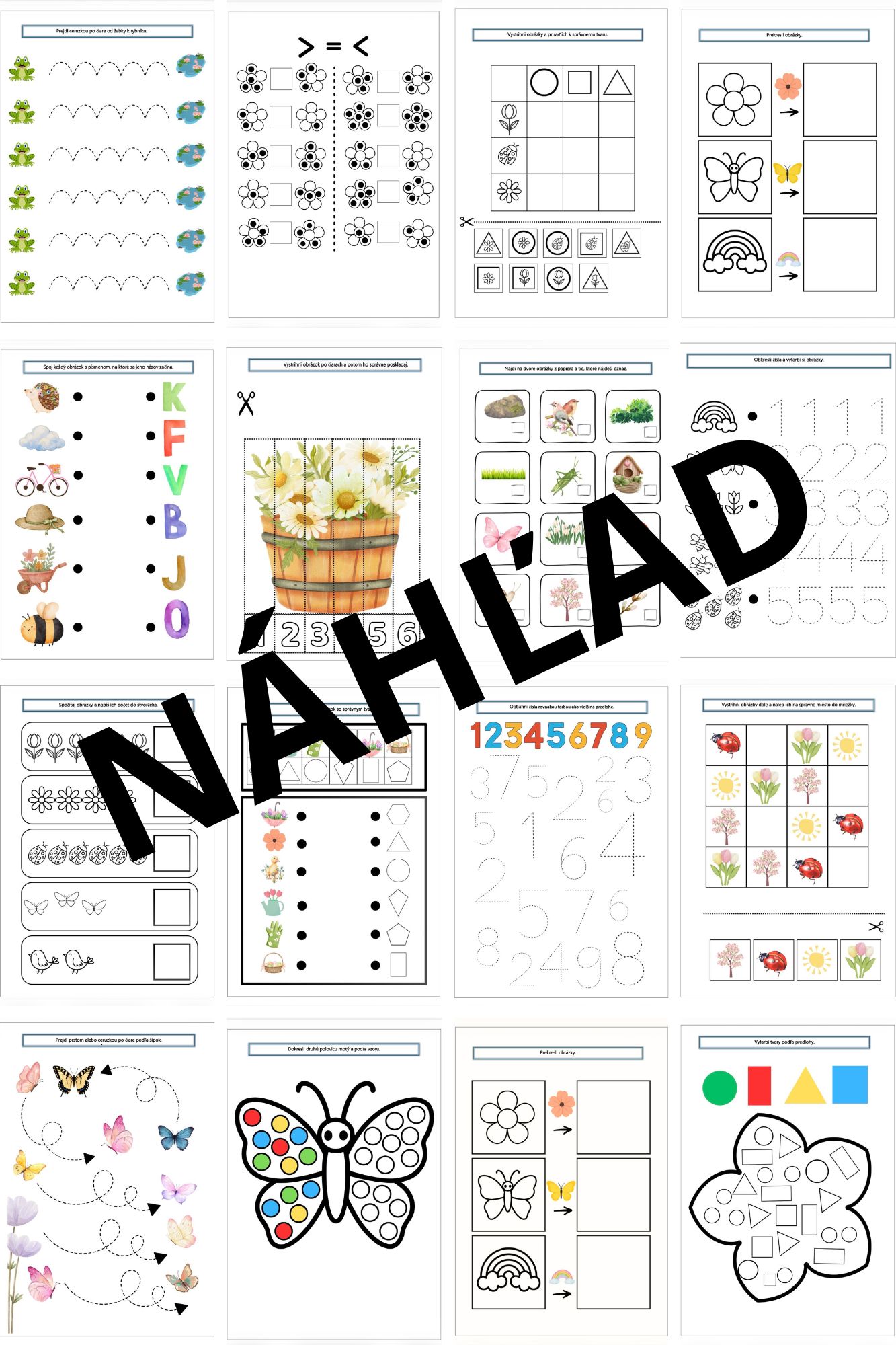 Tento PDF materiál obsahuje súbor hravých pracovných listov zameraných na rozvoj základných schopností detí predškolského veku. Aktivity podporujú jemnú motoriku, grafomotoriku, matematické predstavy, logické myslenie a vnímanie tvarov, farieb a vzorov.