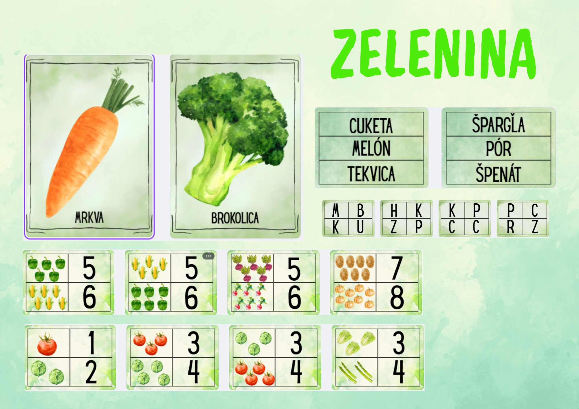 V ponuke je 24 farebných kariet vo veľkosti A4 , 24 kartičiek s ich názvami a 24 kartičiek so začiatočnou hláskou. Na využite v matematických predstavách ponúka 30 kartičiek s číslicami od 1 do 10 a k nim 30 kartičiek s daným počtom zeleniny.
