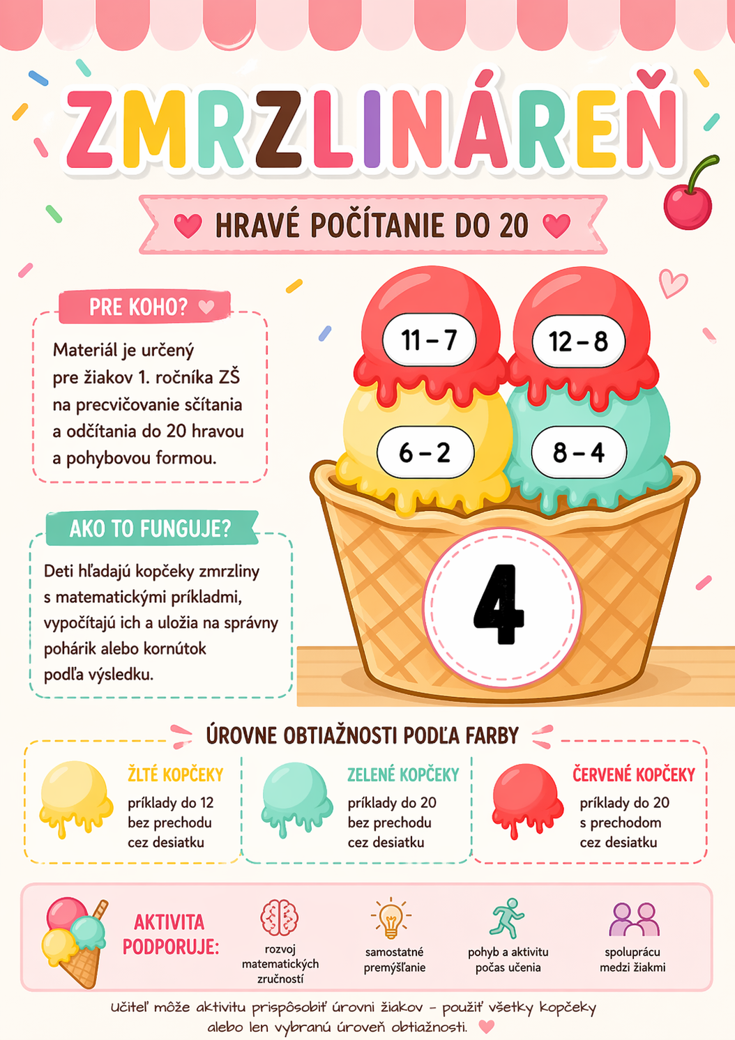 Zábavná pohybová aktivita pre žiakov 1. ročníka ZŠ, pri ktorej deti hľadajú po triede kopčeky zmrzliny s matematickými príkladmi, vypočítajú ich a triedia do správnych zmrzlinových pohárikov podľa výsledku.