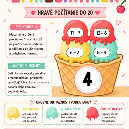 Materiál slúži na precvičovanie sčítania a odčítania do 20 hravou formou a podporuje matematické zručnosti, samostatné premýšľanie aj spoluprácu medzi žiakmi.