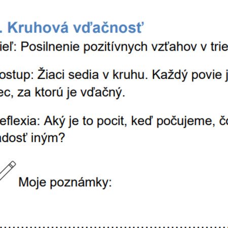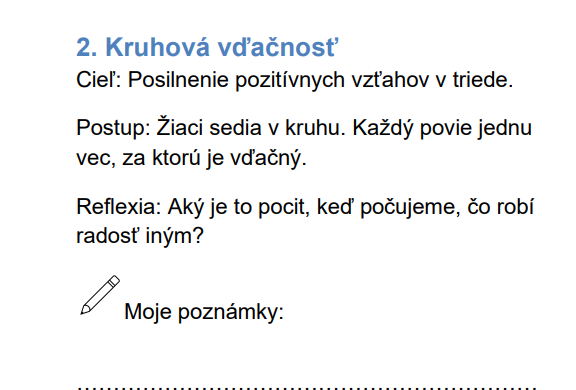 Tento materiál obsahuje 10 krátkych aktivít (5–10 minút), ktoré môže učiteľ okamžite zaradiť do vyučovania. Sú vhodné ako prestávky medzi dvoma blokmi, ranné rituály, odmena na konci hodiny alebo rýchla technika na upokojenie či rozhýbanie žiakov.