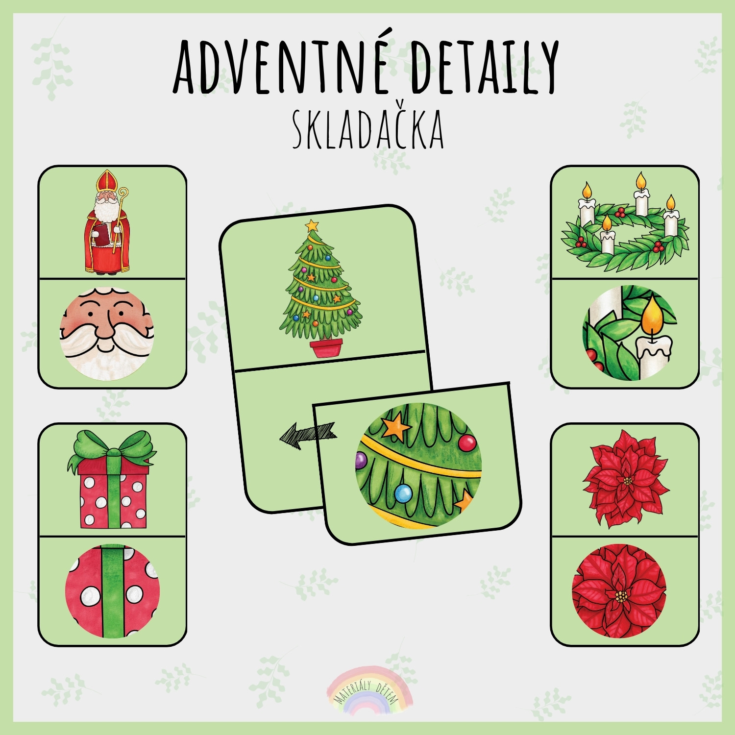 Súbor obsahuje 24 dvojíc kartičiek s adventnou tematikou. Úlohou detí je priradiť ku každému obrázku jeho zodpovedajúci detail. Aktivita rozvíja zrakové vnímanie, pozornosť, porovnávanie, slovnú zásobu a jemnú motoriku.