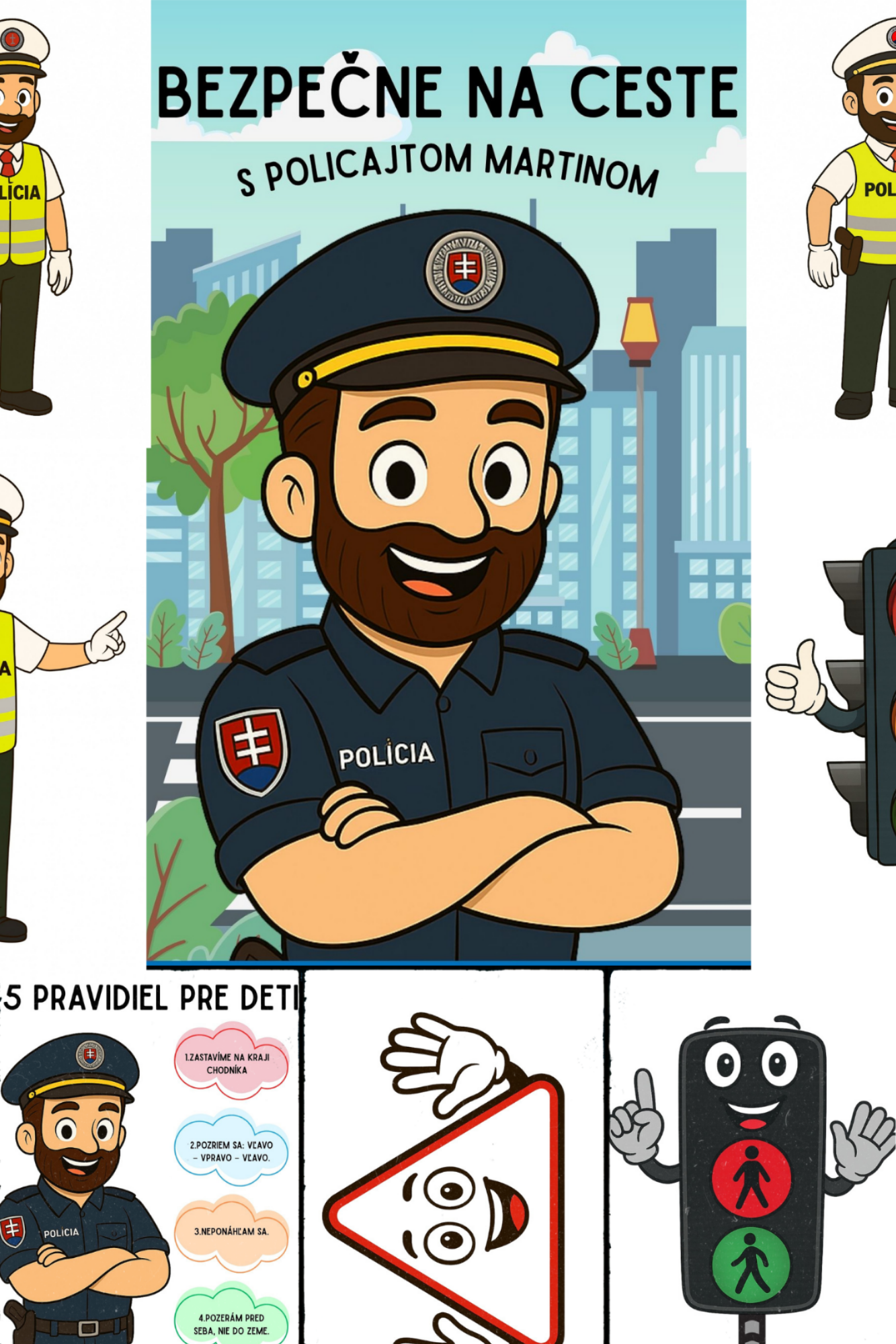 Bezpečne na ceste s policajtom Martinom je komplexný, hravý a vizuálne príťažlivý edukčný materiál zameraný na rozvoj dopravnej výchovy v materskej škole. Materiál je vhodný pre deti vo veku 4–7 rokov a pomáha im pochopiť základné pravidlá cestnej premávky jednoduchým, zábavným a interaktívnym spôsobom.