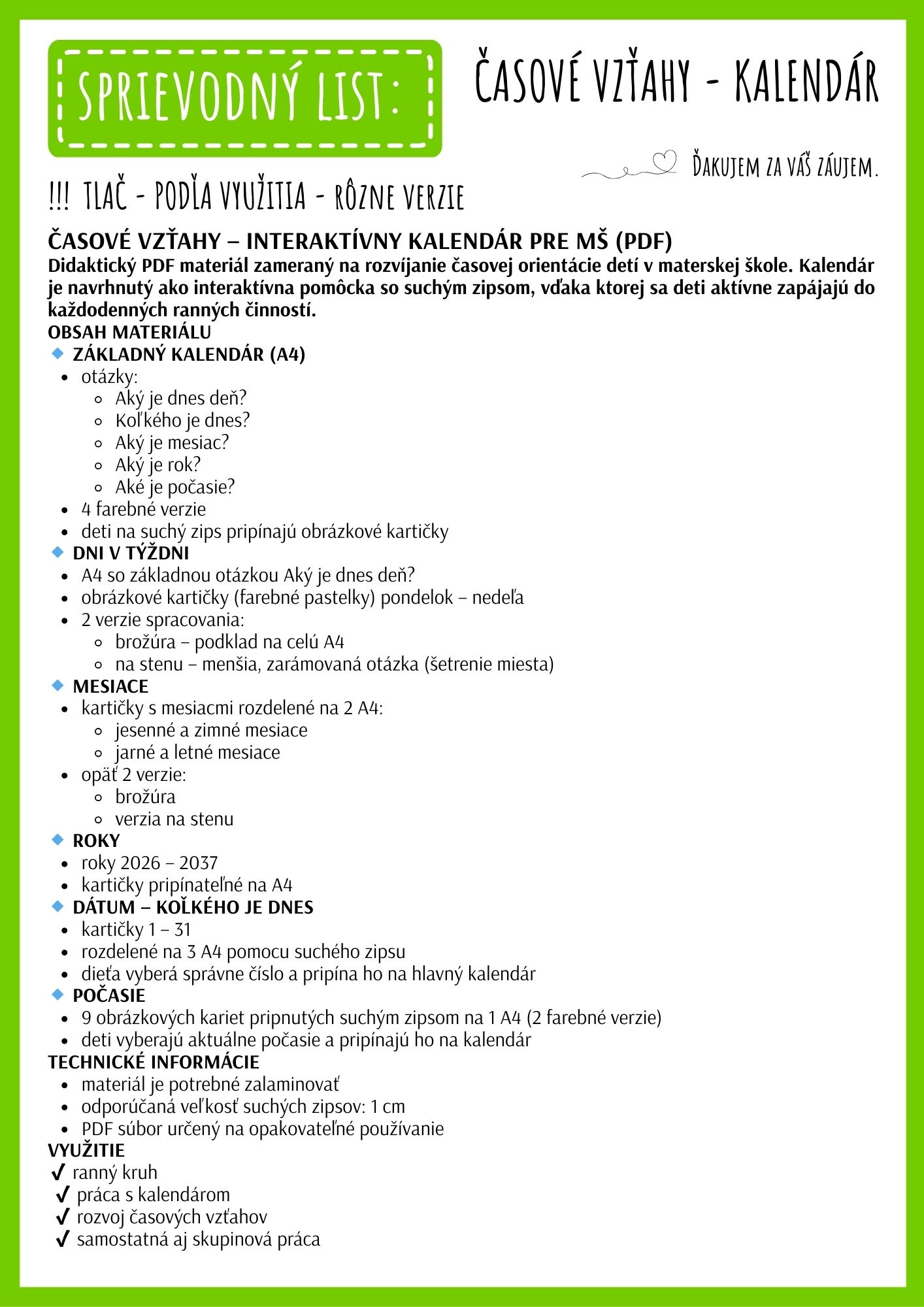 Didaktický PDF materiál zameraný na rozvoj časovej orientácie detí v materskej škole. Interaktívny kalendár so suchým zipsom je vhodný na každodennú prácu počas ranného kruhu.