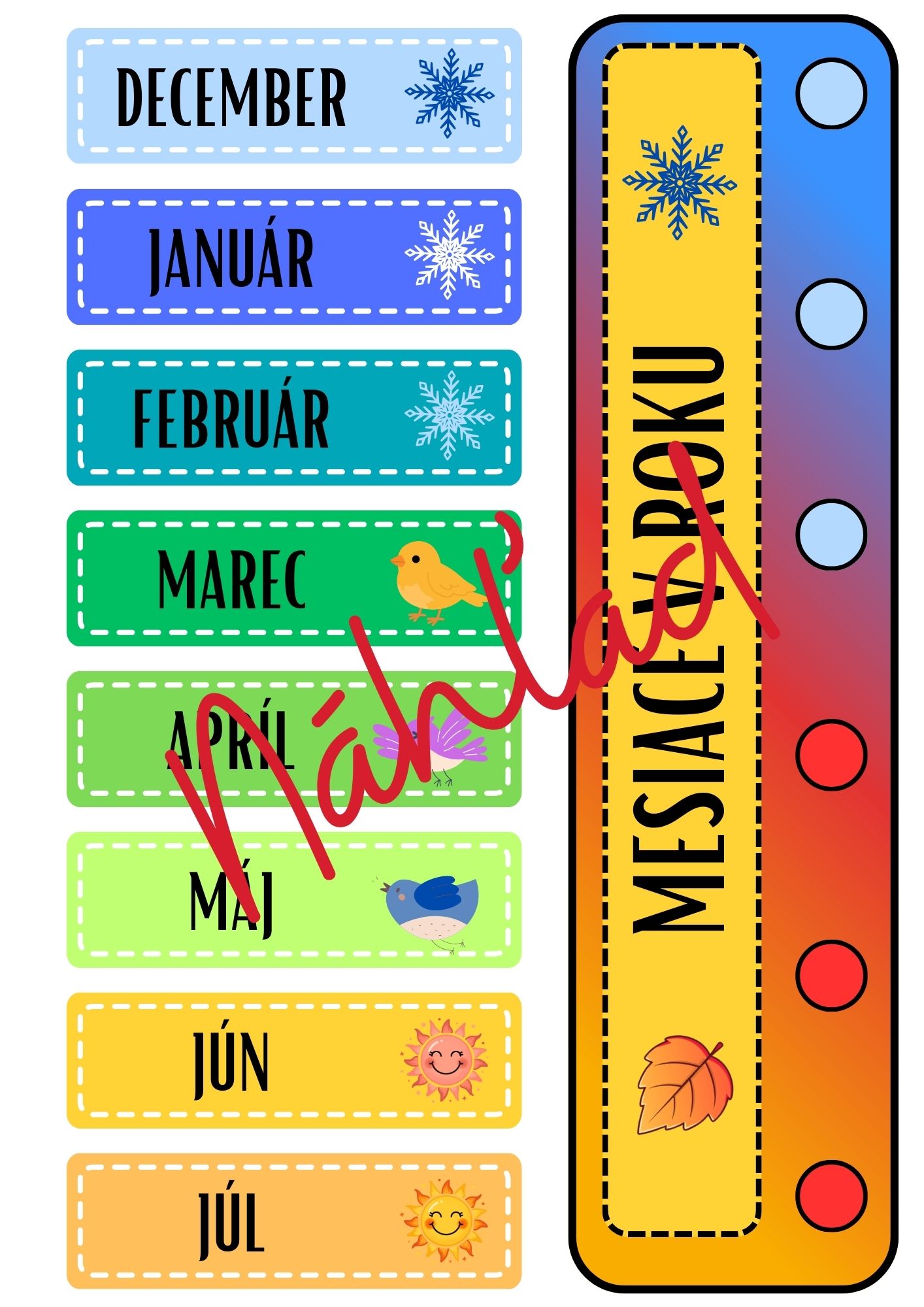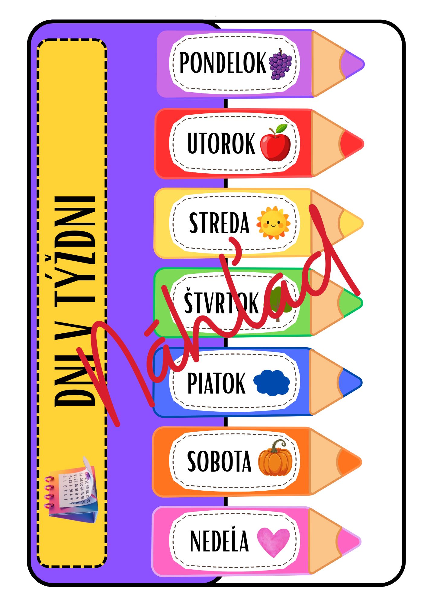 - dni v týždni (pondelok – nedeľa) – brožúra aj verzia na stenu